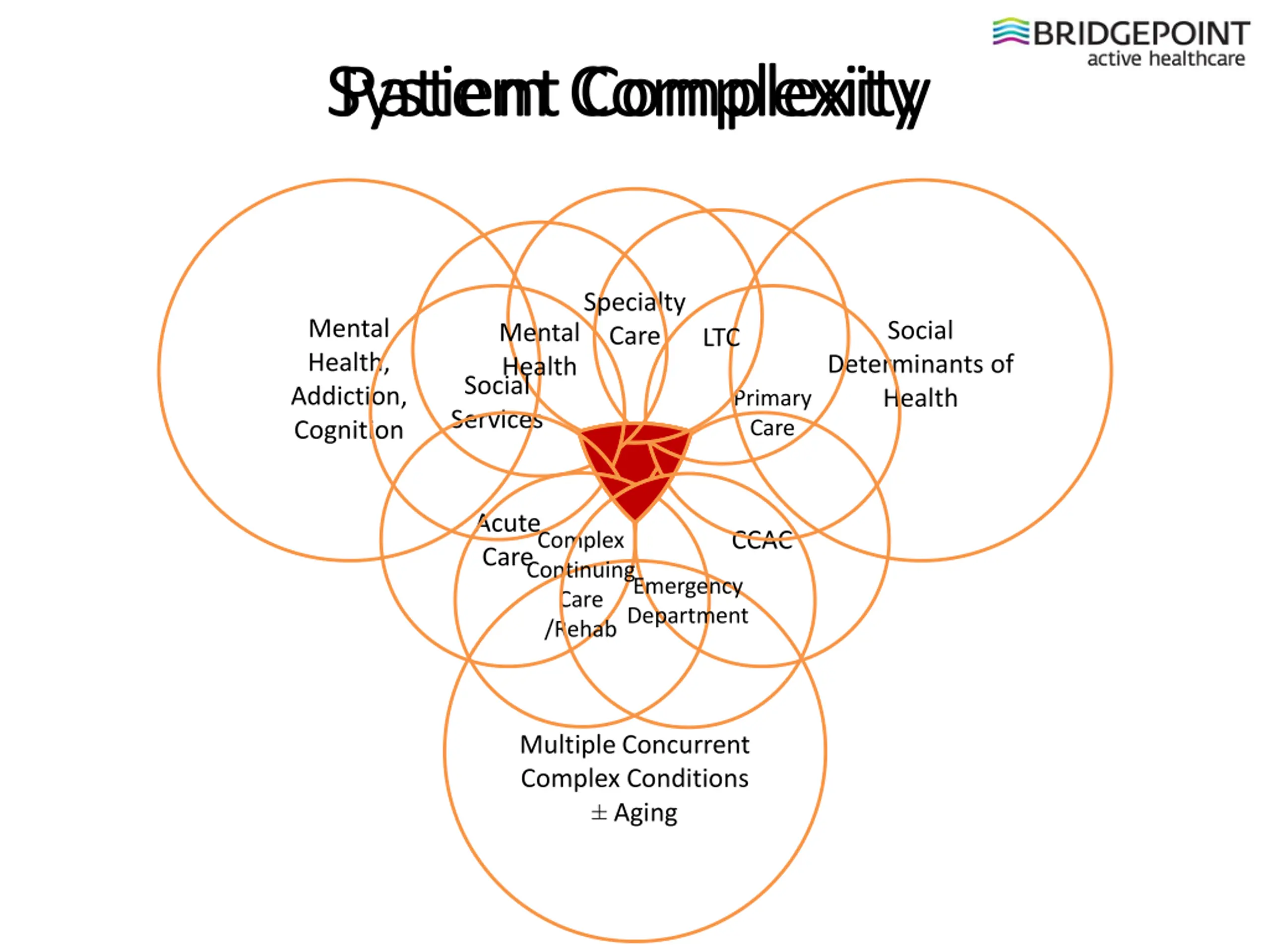 Patient Complexity System Complexity Specialty Care Mental Health, Addiction, Cognition Social Mental Health Social Services LTC Determinants of Health Primary Care Acute CareComplex Continuing CCAC Emergency Department Care /Rehab Multiple Concurrent Complex Conditions Aging