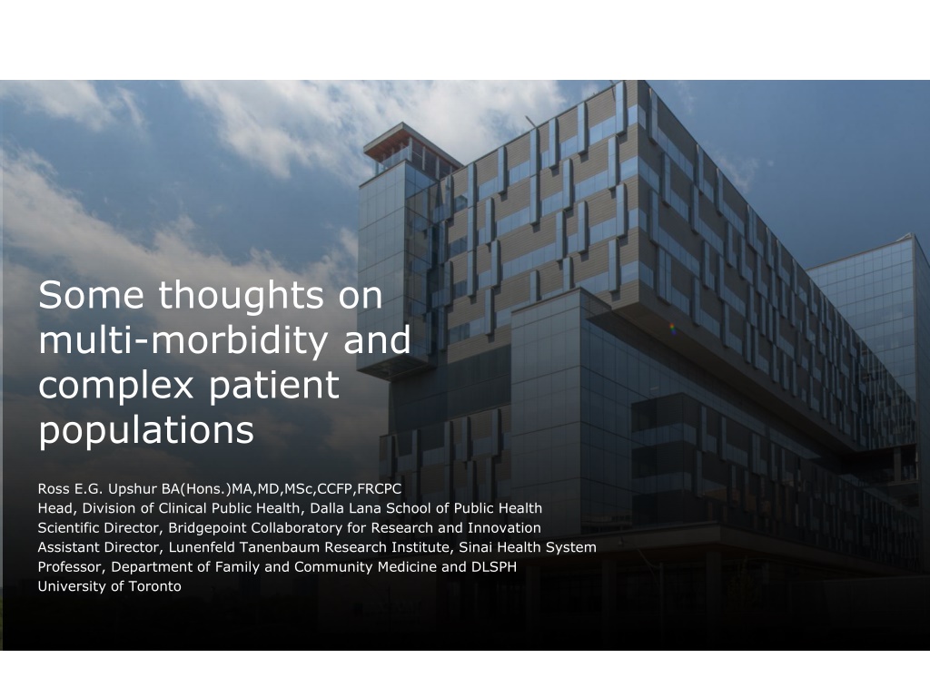 Some thoughts on multi-morbidity and complex patient populations Ross E.G. Upshur BA(Hons.)MA,MD,MSc,CCFP,FRCPC Head, Division of Clinical Public Health, Dalla Lana School of Public Health Scientific Director, Bridgepoint Collaboratory for Research and Innovation Assistant Director, Lunenfeld Tanenbaum Research Institute, Sinai Health System Professor, Department of Family and Community Medicine and DLSPH University of Toronto