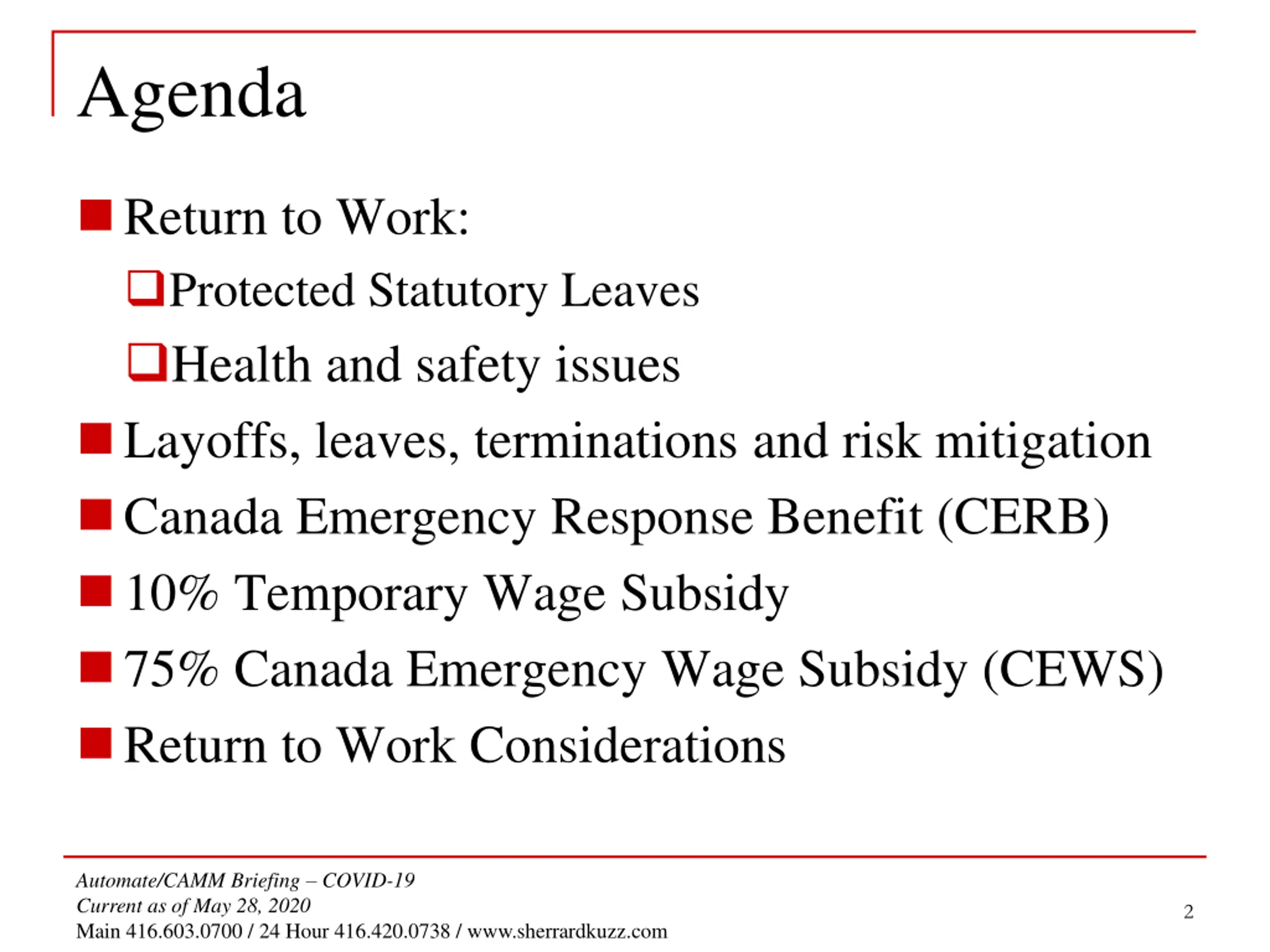 Agenda Return to Work: Protected Statutory Leaves Health and safety issues Layoffs, leaves, terminations and risk mitigation Canada Emergency Response Benefit (CERB) 10% Temporary Wage Subsidy 75% Canada Emergency Wage Subsidy (CEWS) Return to Work Considerations Automate/CAMM Briefing COVID-19 Current as of May 28, 2020 Main 416.603.0700 / 24 Hour 416.420.0738 / www.sherrardkuzz.com 2