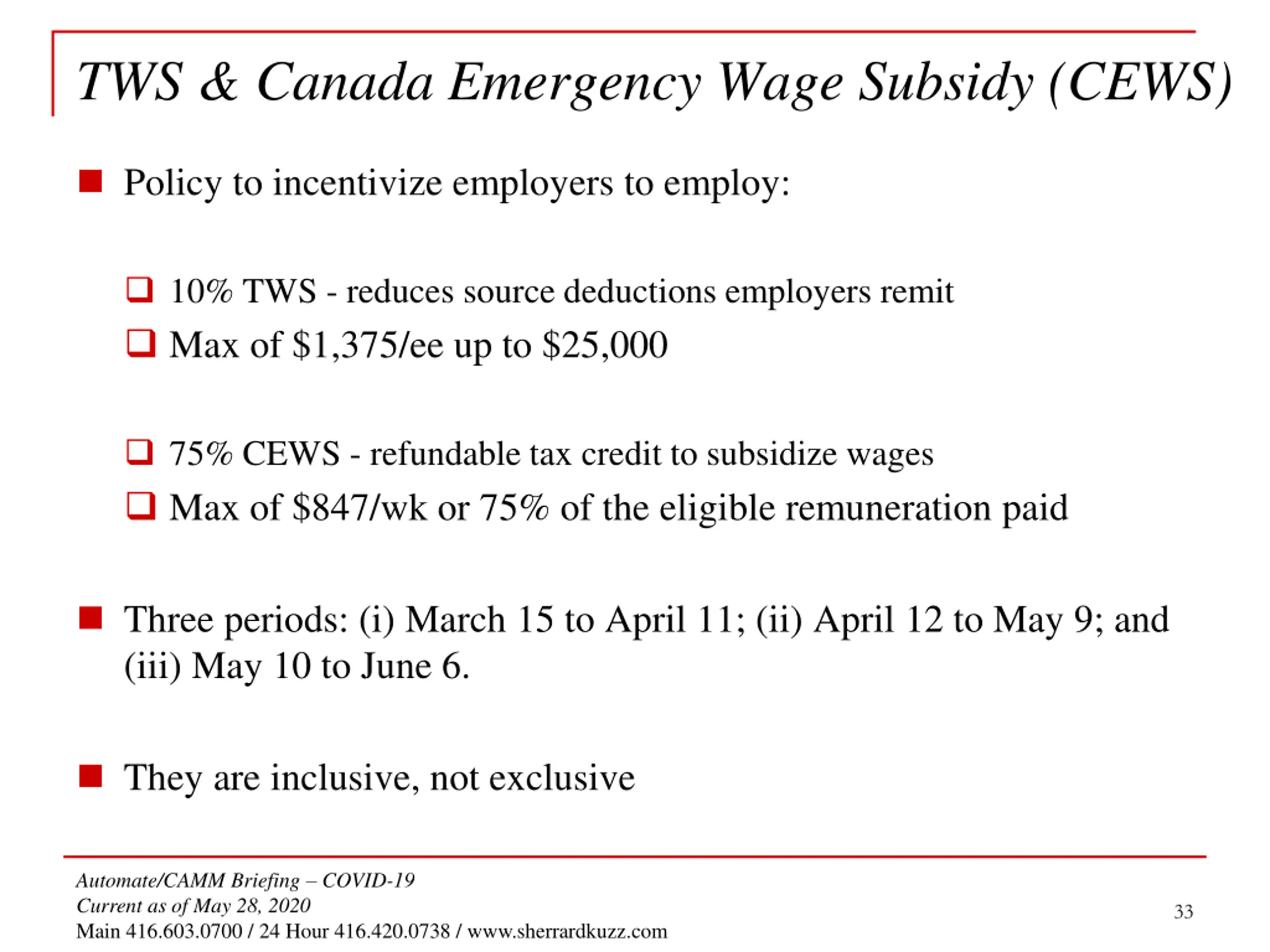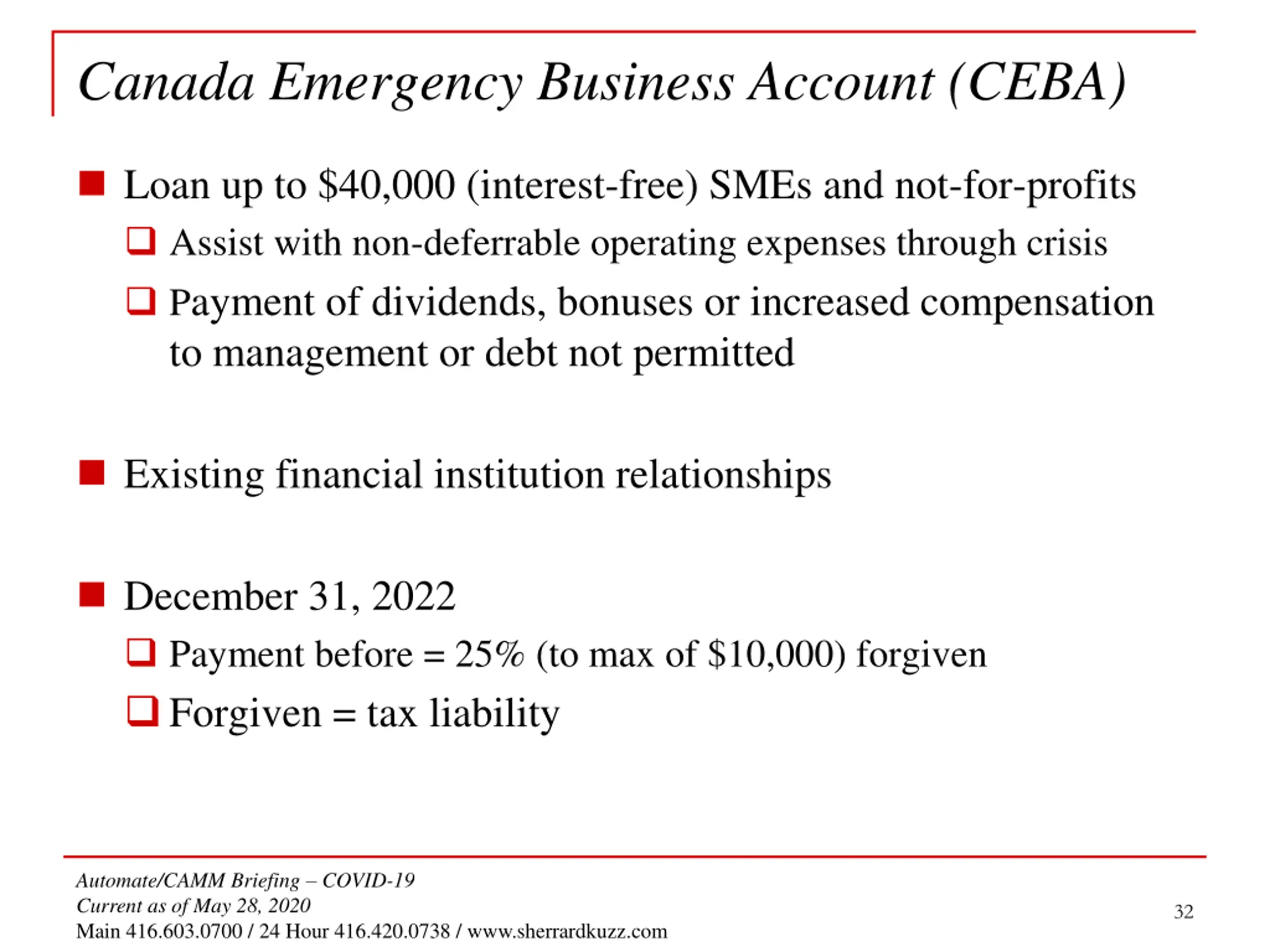 Canada Emergency Business Account (CEBA) Loan up to $40,000 (interest-free) SMEs and not-for-profits Assist with non-deferrable operating expenses through crisis Payment of dividends, bonuses or increased compensation to management or debt not permitted Existing financial institution relationships December 31, 2022 Payment before = 25% (to max of $10,000) forgiven Forgiven = tax liability Automate/CAMM Briefing COVID-19 Current as of May 28, 2020 Main 416.603.0700 / 24 Hour 416.420.0738 / www.sherrardkuzz.com 32