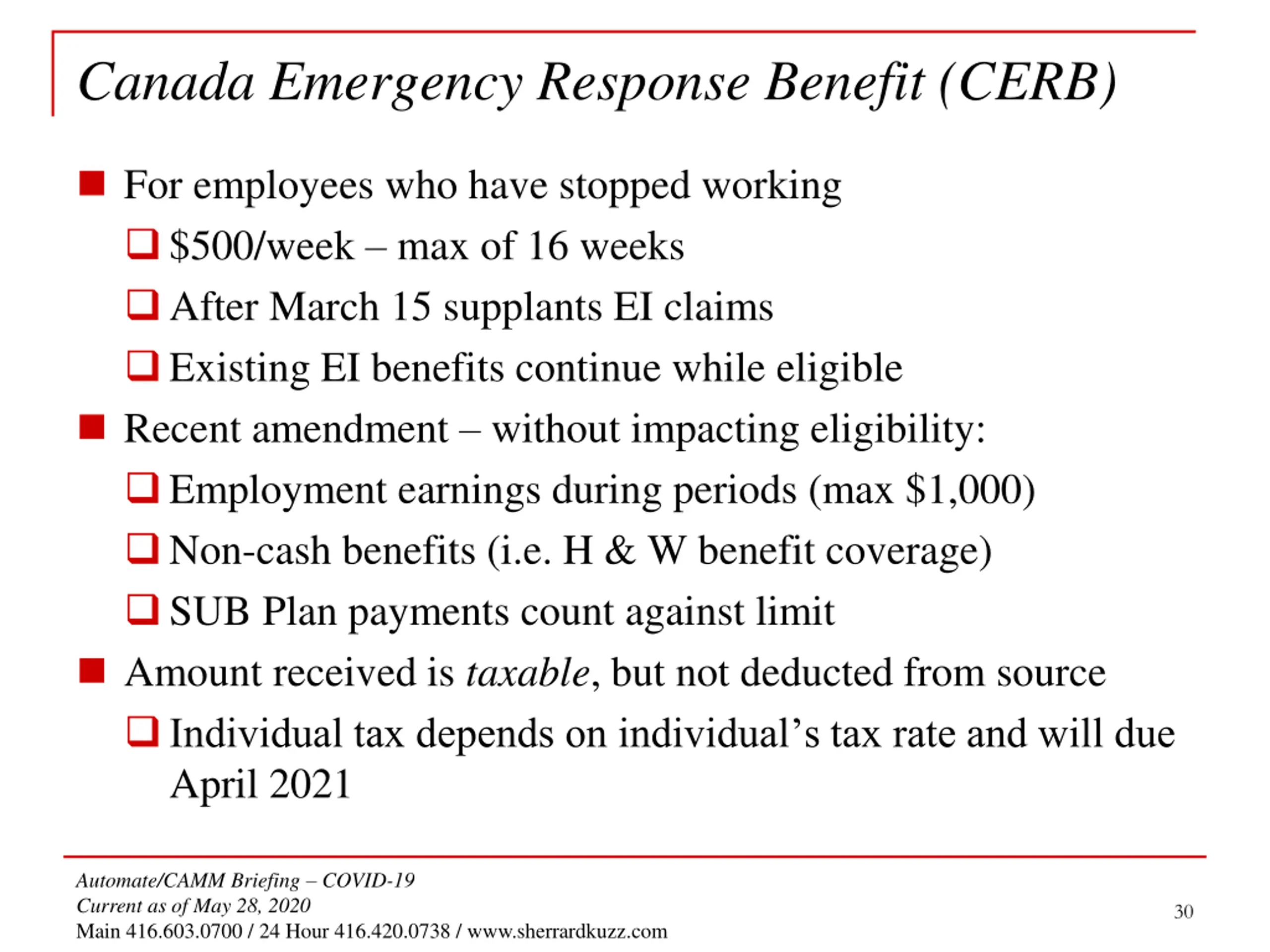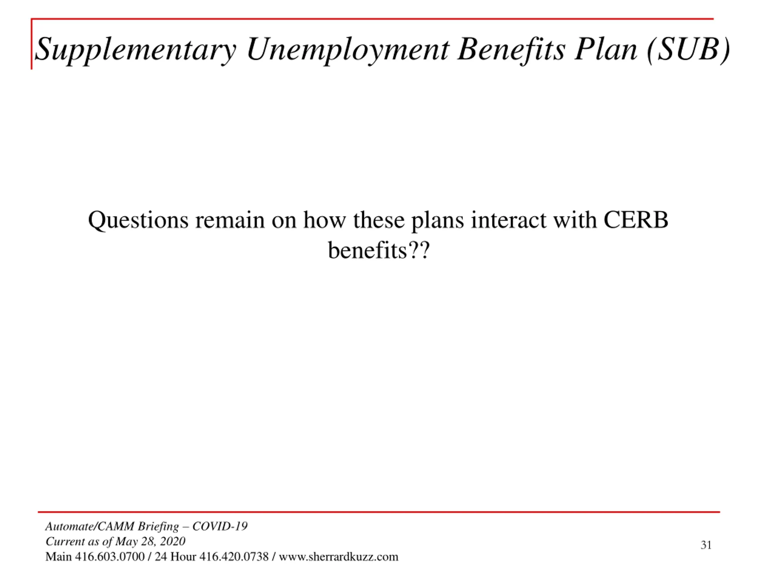 Canada Emergency Response Benefit (CERB) For employees who have stopped working $500/week max of 16 weeks After March 15 supplants EI claims Existing EI benefits continue while eligible Recent amendment without impacting eligibility: Employment earnings during periods (max $1,000) Non-cash benefits (i.e. H & W benefit coverage) SUB Plan payments count against limit Amount received is taxable, but not deducted from source Individual tax depends on individual s tax rate and will due April 2021 Automate/CAMM Briefing COVID-19 Current as of May 28, 2020 Main 416.603.0700 / 24 Hour 416.420.0738 / www.sherrardkuzz.com 30