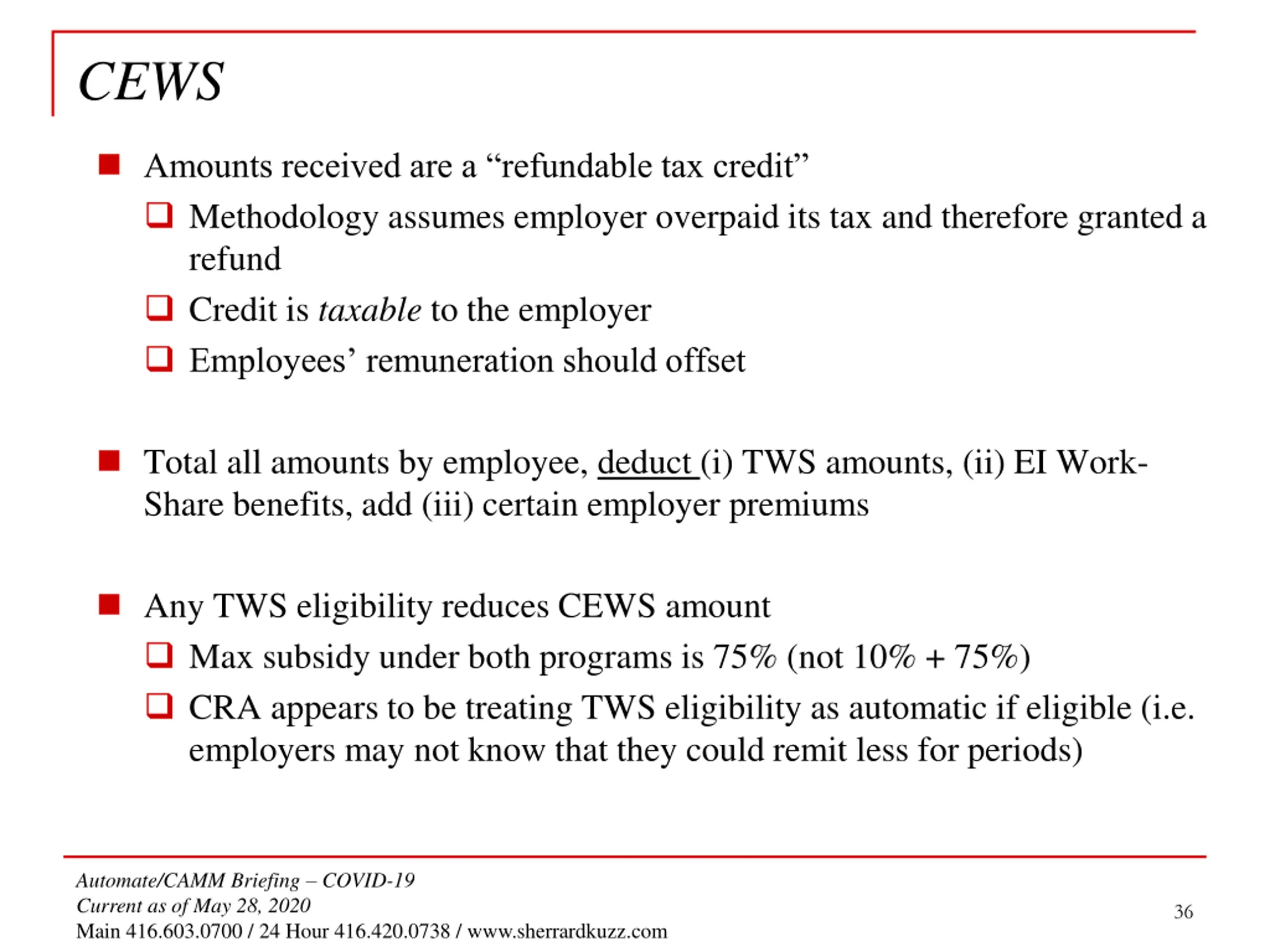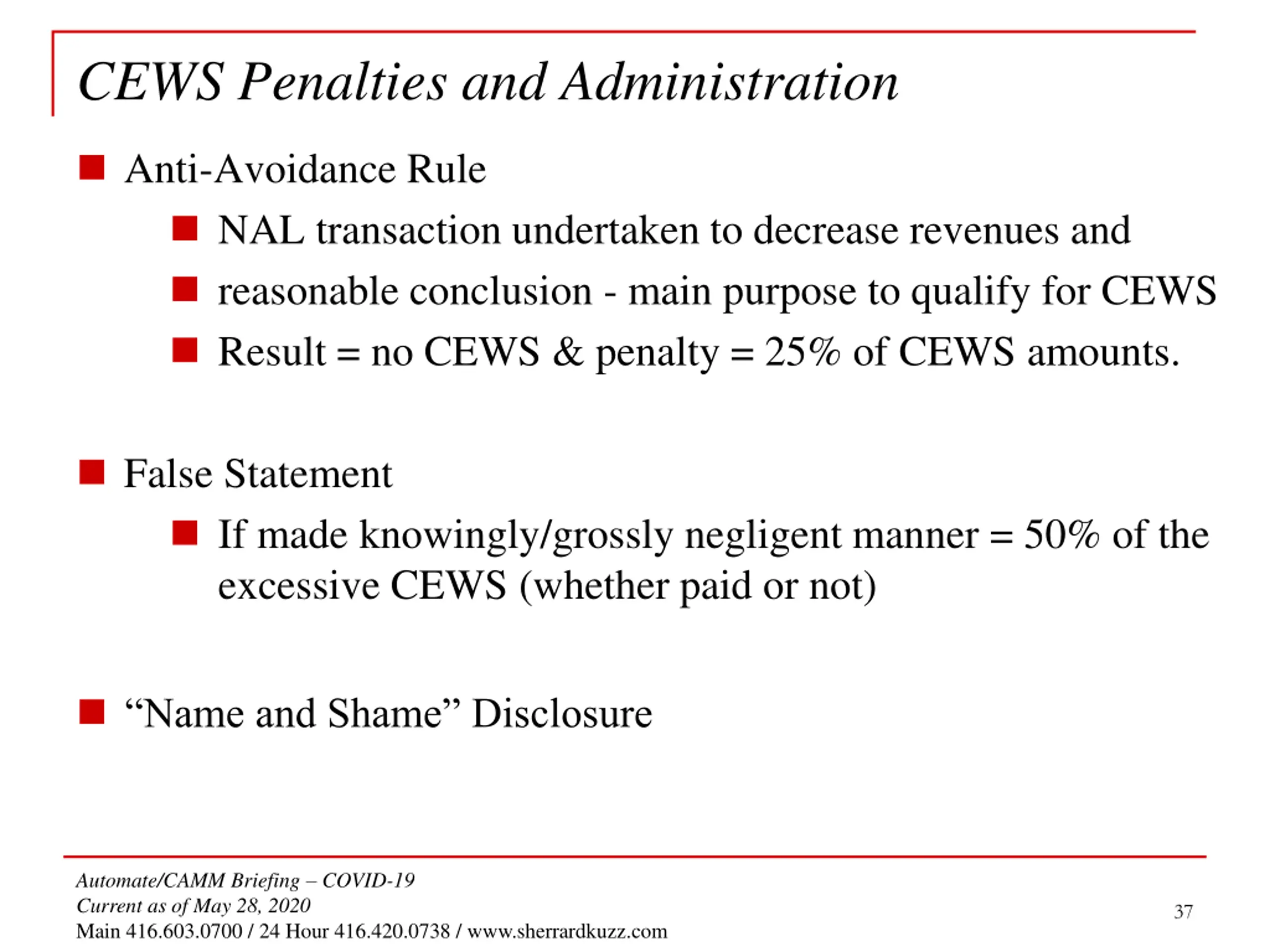 CEWS Amounts received are a refundable tax credit Methodology assumes employer overpaid its tax and therefore granted a refund Credit is taxable to the employer Employees remuneration should offset Total all amounts by employee, deduct (i) TWS amounts, (ii) EI Work- Share benefits, add (iii) certain employer premiums Any TWS eligibility reduces CEWS amount Max subsidy under both programs is 75% (not 10% + 75%) CRA appears to be treating TWS eligibility as automatic if eligible (i.e. employers may not know that they could remit less for periods) Automate/CAMM Briefing COVID-19 Current as of May 28, 2020 Main 416.603.0700 / 24 Hour 416.420.0738 / www.sherrardkuzz.com 36
