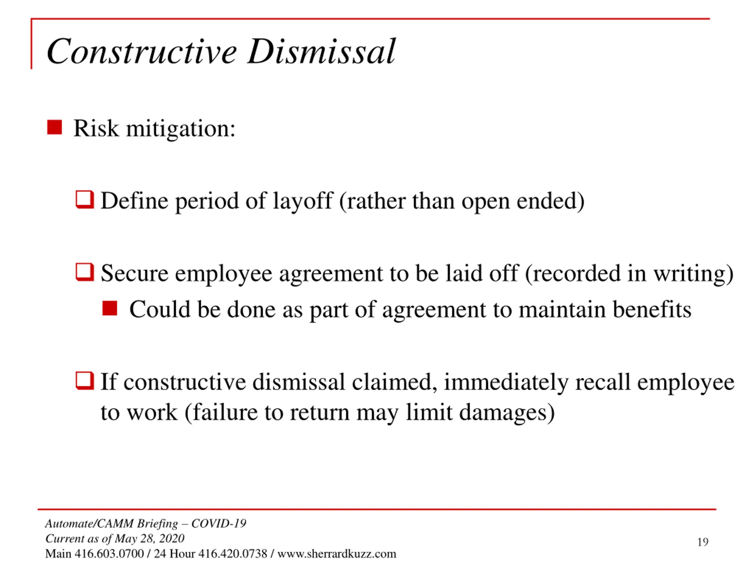 Constructive Dismissal Risk mitigation: Define period of layoff (rather than open ended) Secure employee agreement to be laid off (recorded in writing) Could be done as part of agreement to maintain benefits If constructive dismissal claimed, immediately recall employee to work (failure to return may limit damages) Automate/CAMM Briefing COVID-19 Current as of May 28, 2020 Main 416.603.0700 / 24 Hour 416.420.0738 / www.sherrardkuzz.com 19