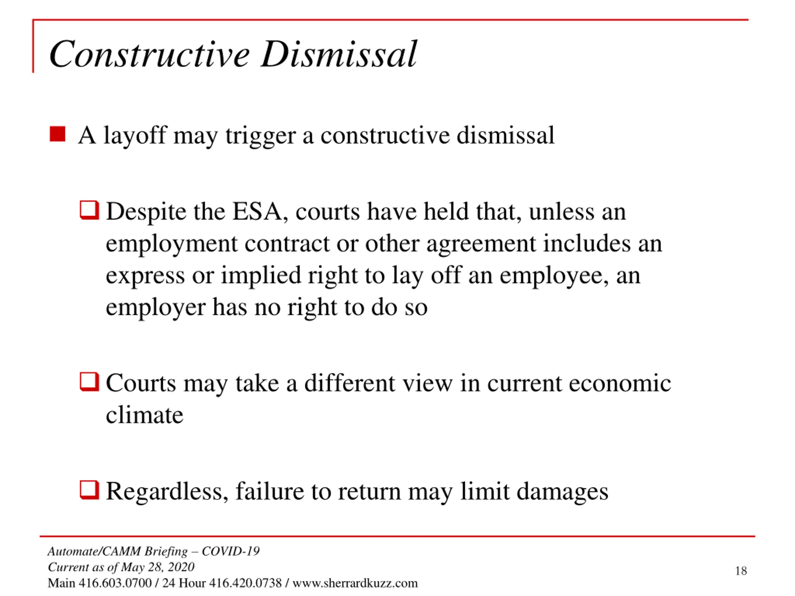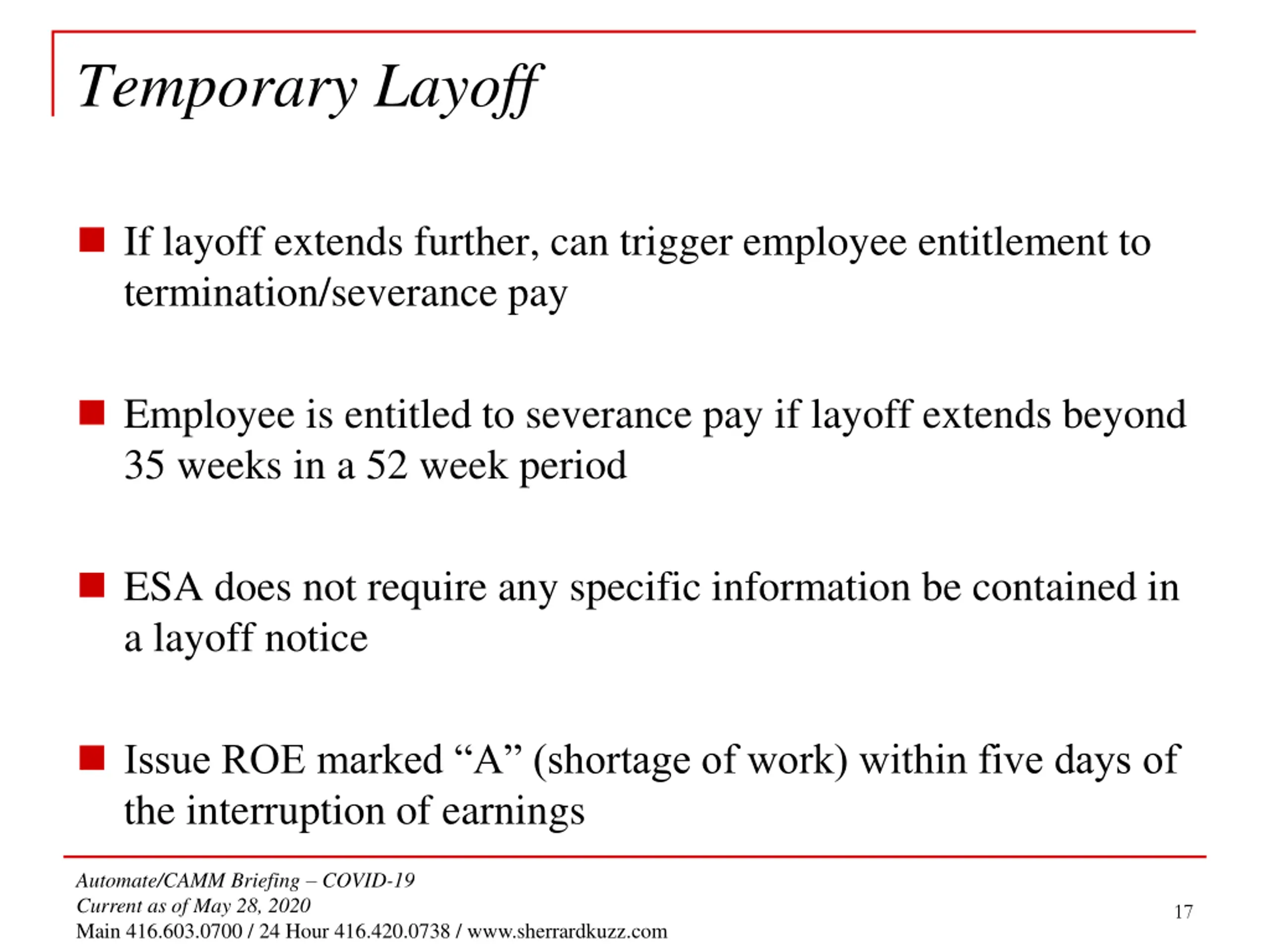 Temporary Layoff If layoff extends further, can trigger employee entitlement to termination/severance pay Employee is entitled to severance pay if layoff extends beyond 35 weeks in a 52 week period ESA does not require any specific information be contained in a layoff notice Issue ROE marked A (shortage of work) within five days of the interruption of earnings Automate/CAMM Briefing COVID-19 Current as of May 28, 2020 Main 416.603.0700 / 24 Hour 416.420.0738 / www.sherrardkuzz.com 17