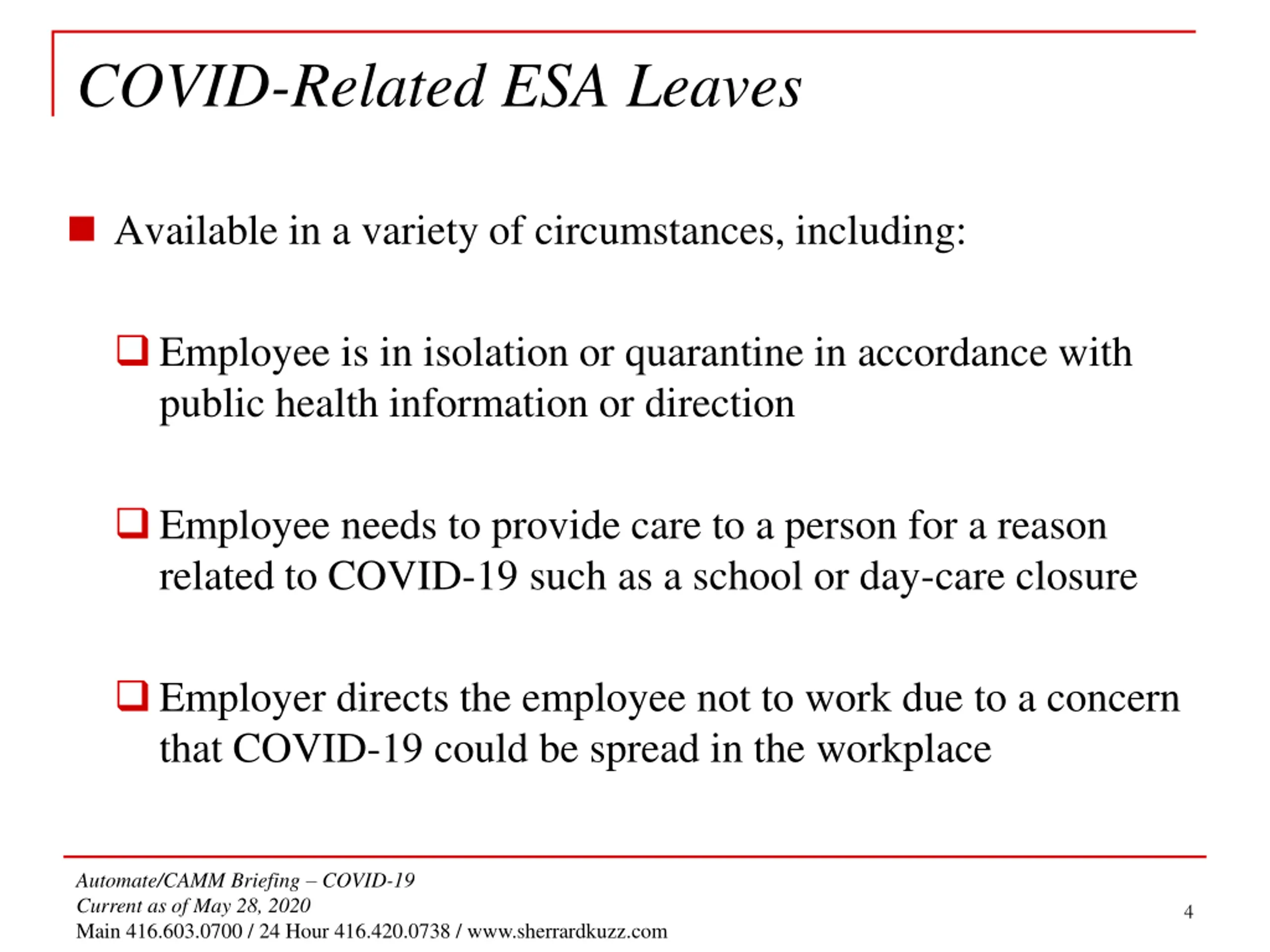 COVID-Related ESA Leaves Emergency Leave: Declared Emergencies and Infectious Disease Emergencies Provides a job protected leave where employee unable to work due to COVID-19 related issues Retroactive to January 25, 2020 Will remain in place indefinitely Automate/CAMM Briefing COVID-19 Current as of May 28, 2020 Main 416.603.0700 / 24 Hour 416.420.0738 / www.sherrardkuzz.com 3
