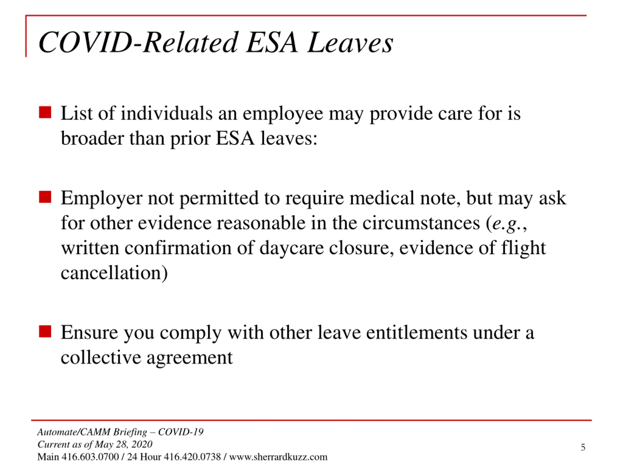 COVID-Related ESA Leaves Available in a variety of circumstances, including: Employee is in isolation or quarantine in accordance with public health information or direction Employee needs to provide care to a person for a reason related to COVID-19 such as a school or day-care closure Employer directs the employee not to work due to a concern that COVID-19 could be spread in the workplace Automate/CAMM Briefing COVID-19 Current as of May 28, 2020 Main 416.603.0700 / 24 Hour 416.420.0738 / www.sherrardkuzz.com 4