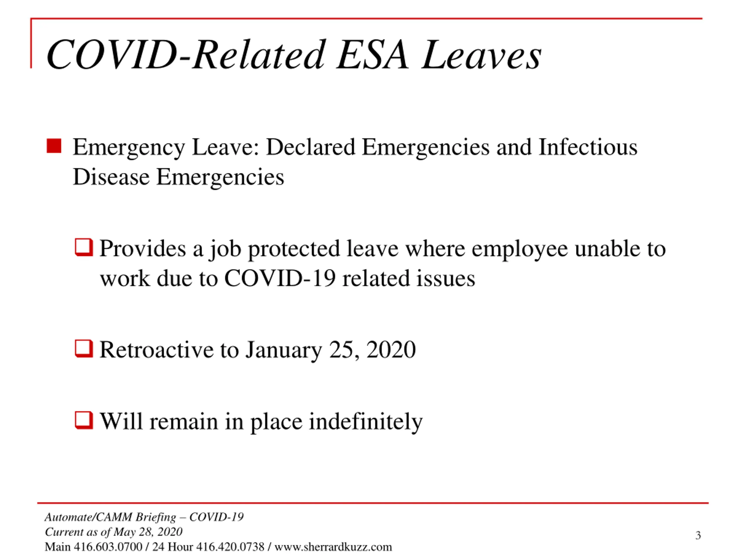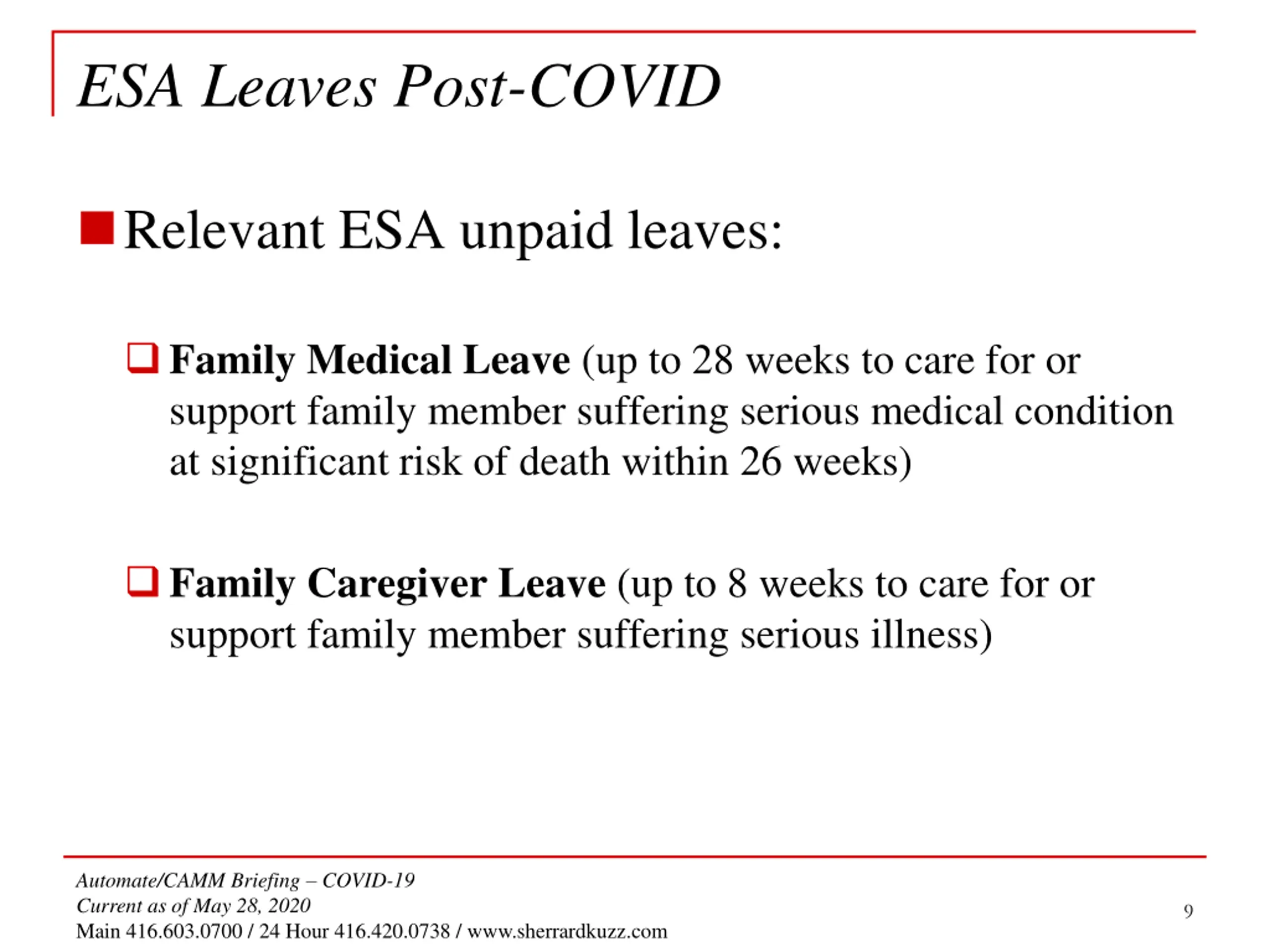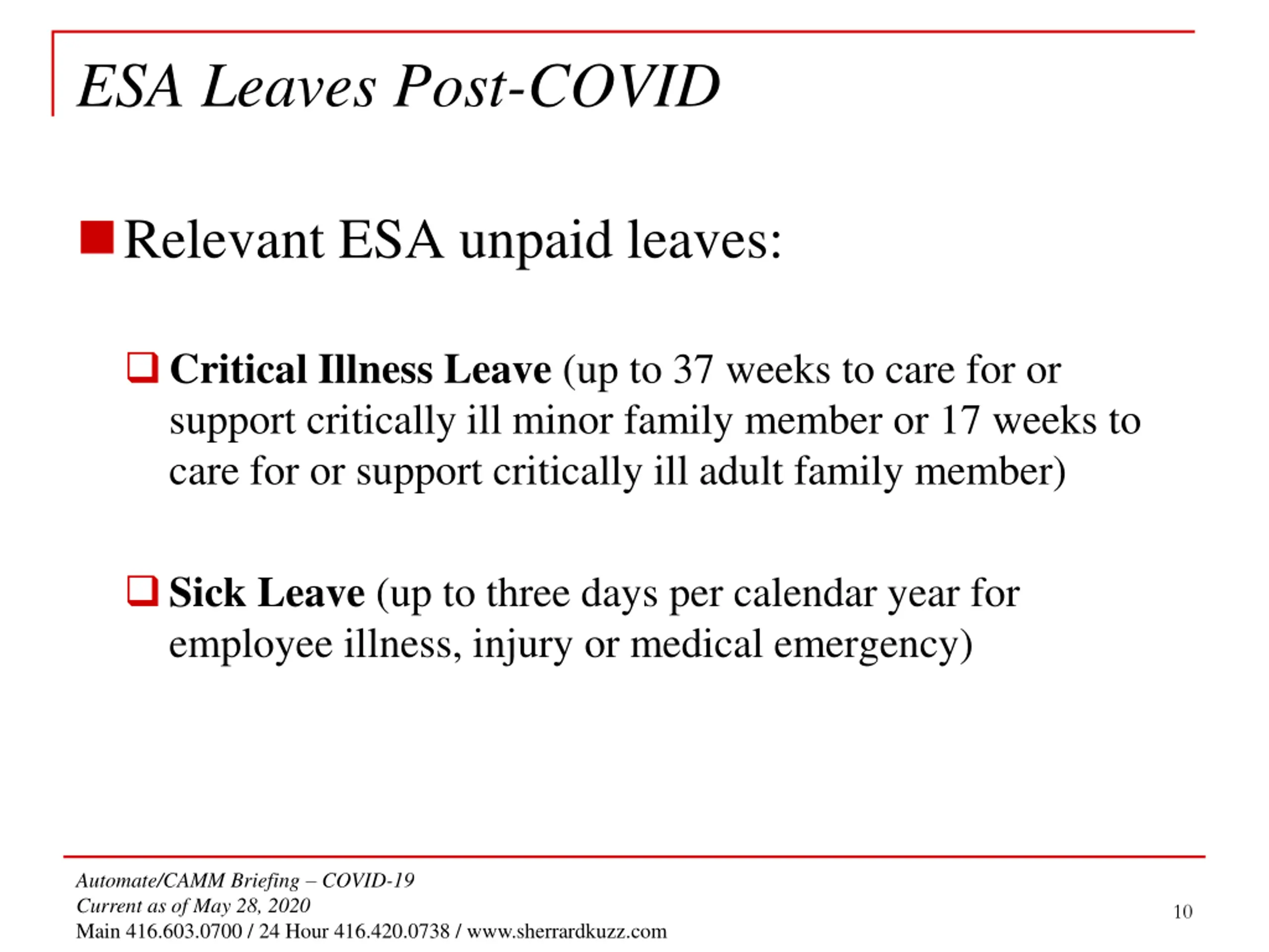 ESA Leaves Post-COVID Relevant ESA unpaid leaves: Family Medical Leave (up to 28 weeks to care for or support family member suffering serious medical condition at significant risk of death within 26 weeks) Family Caregiver Leave (up to 8 weeks to care for or support family member suffering serious illness) Automate/CAMM Briefing COVID-19 Current as of May 28, 2020 Main 416.603.0700 / 24 Hour 416.420.0738 / www.sherrardkuzz.com 9