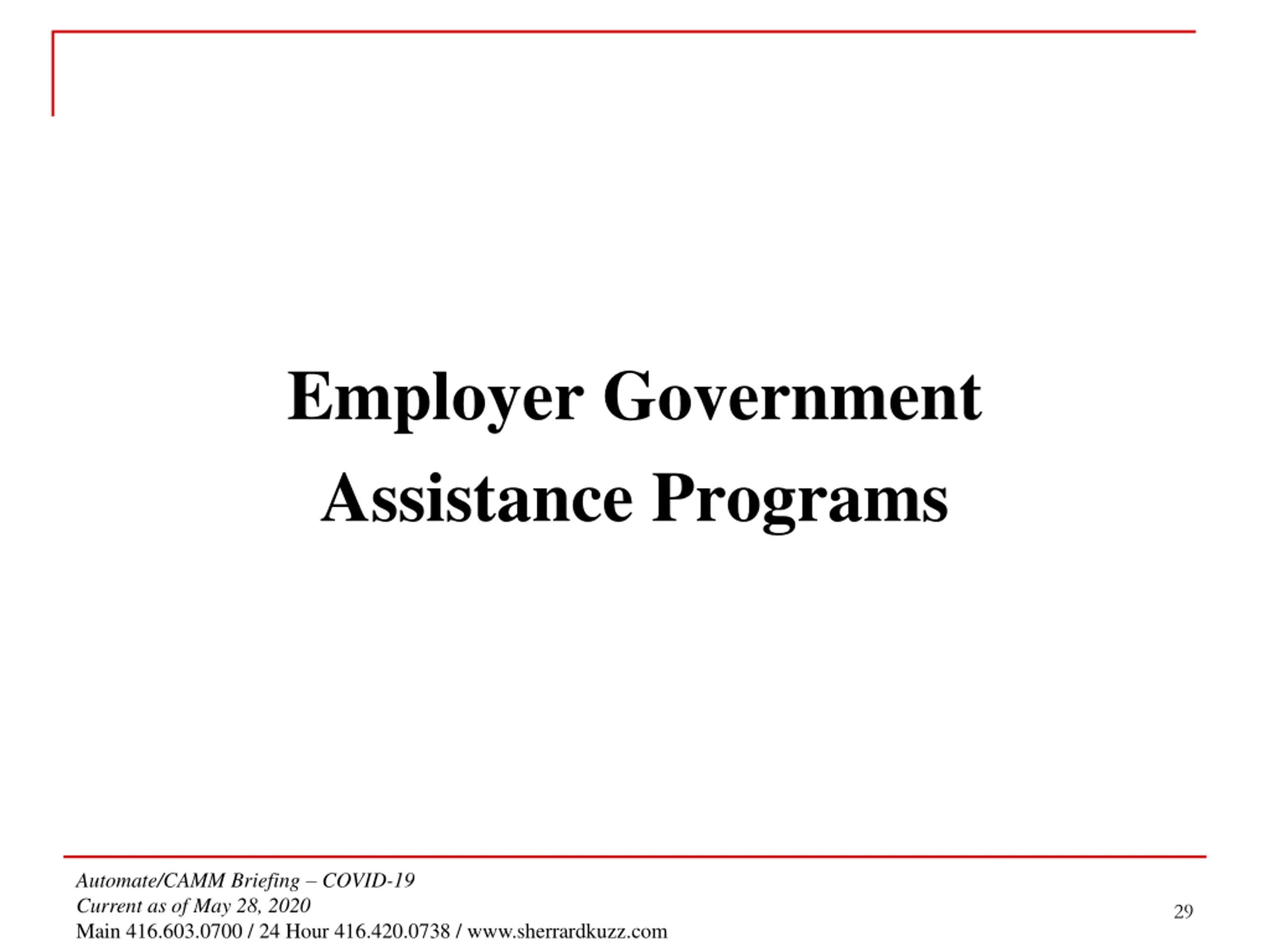 Employer Government Assistance Programs Automate/CAMM Briefing COVID-19 Current as of May 28, 2020 Main 416.603.0700 / 24 Hour 416.420.0738 / www.sherrardkuzz.com 29