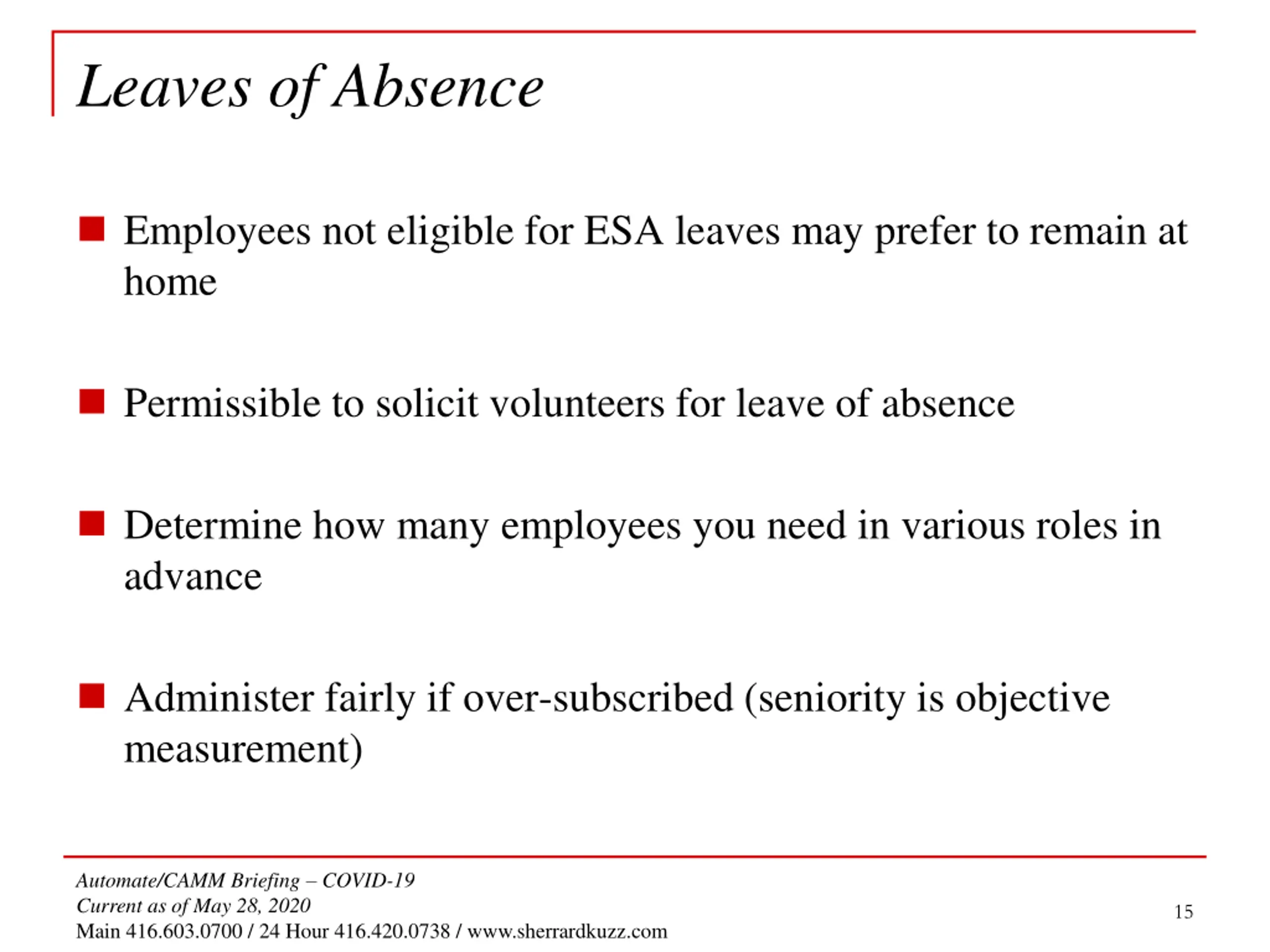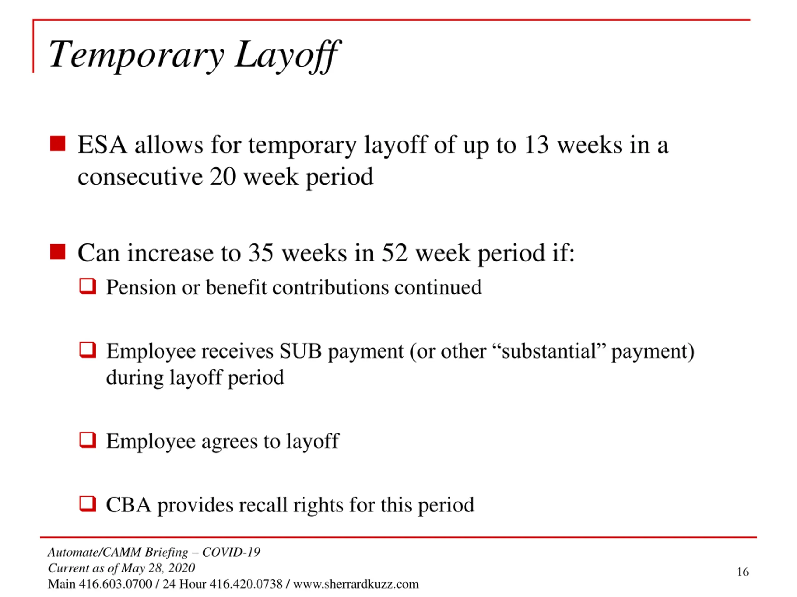 Leaves of Absence Employees not eligible for ESA leaves may prefer to remain at home Permissible to solicit volunteers for leave of absence Determine how many employees you need in various roles in advance Administer fairly if over-subscribed (seniority is objective measurement) Automate/CAMM Briefing COVID-19 Current as of May 28, 2020 Main 416.603.0700 / 24 Hour 416.420.0738 / www.sherrardkuzz.com 15