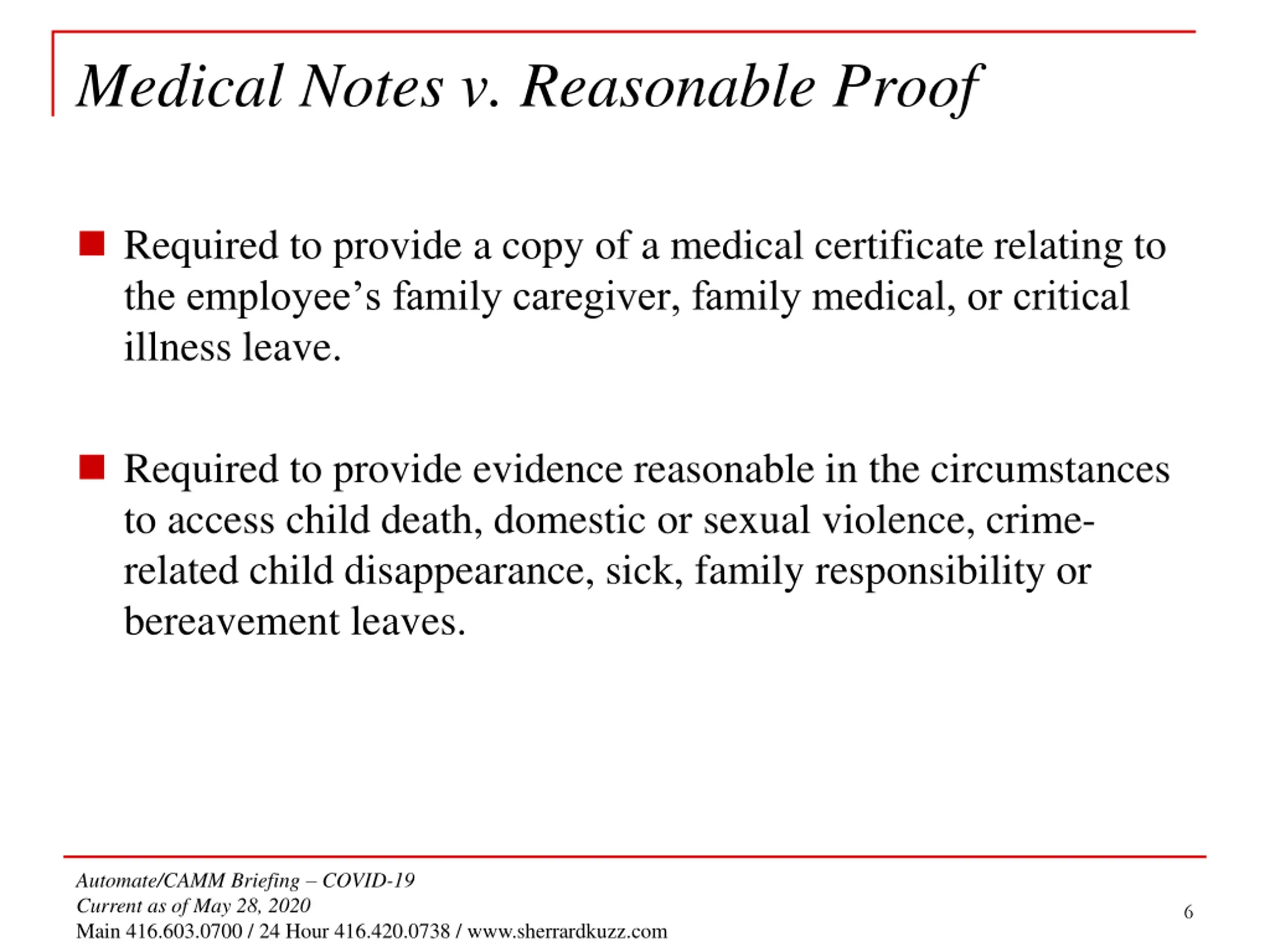 Medical Notes v. Reasonable Proof Required to provide a copy of a medical certificate relating to the employee s family caregiver, family medical, or critical illness leave. Required to provide evidence reasonable in the circumstances to access child death, domestic or sexual violence, crime- related child disappearance, sick, family responsibility or bereavement leaves. Automate/CAMM Briefing COVID-19 Current as of May 28, 2020 Main 416.603.0700 / 24 Hour 416.420.0738 / www.sherrardkuzz.com 6