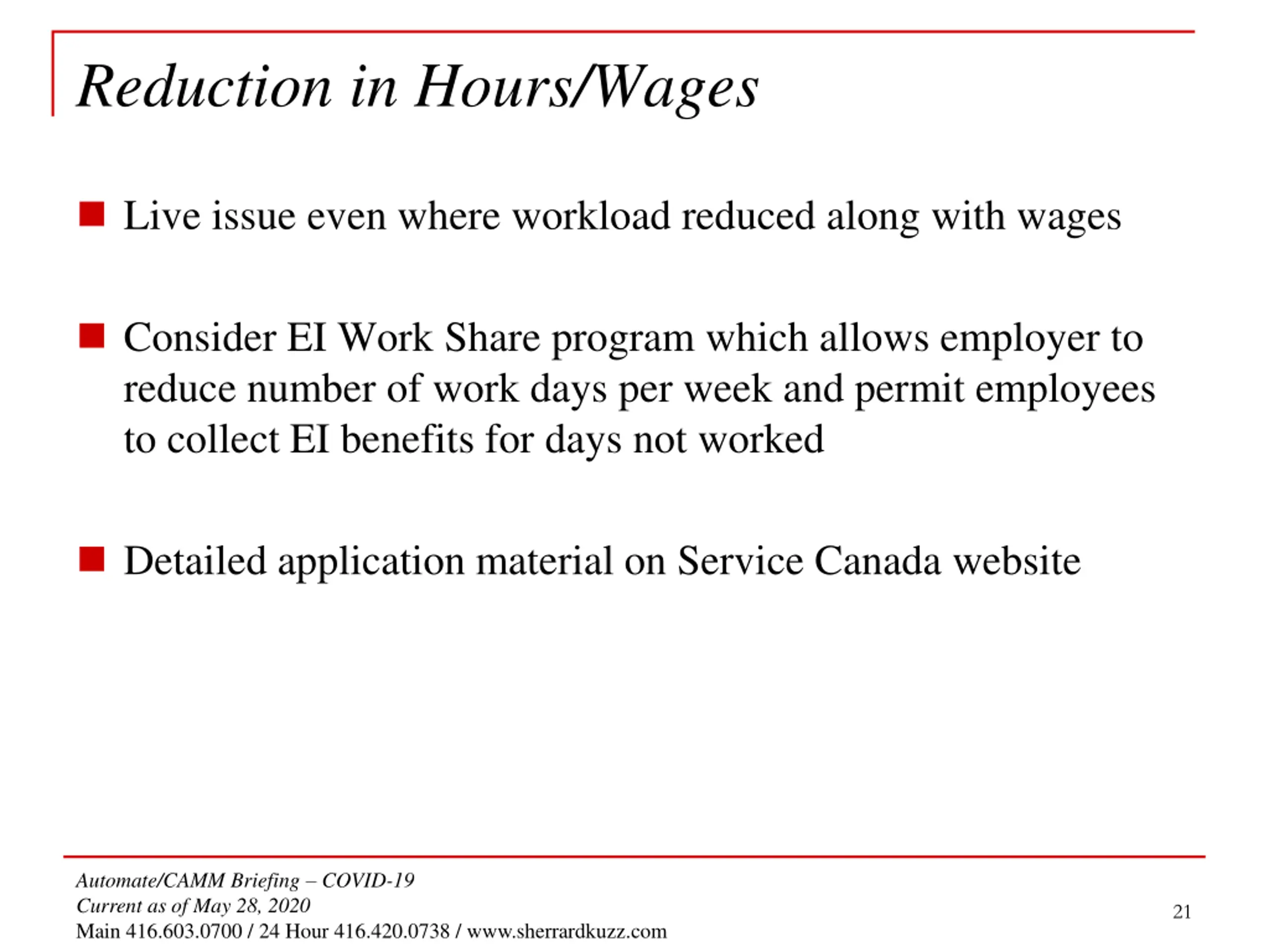 Reduction in Hours/Wages Live issue even where workload reduced along with wages Consider EI Work Share program which allows employer to reduce number of work days per week and permit employees to collect EI benefits for days not worked Detailed application material on Service Canada website Automate/CAMM Briefing COVID-19 Current as of May 28, 2020 Main 416.603.0700 / 24 Hour 416.420.0738 / www.sherrardkuzz.com 21