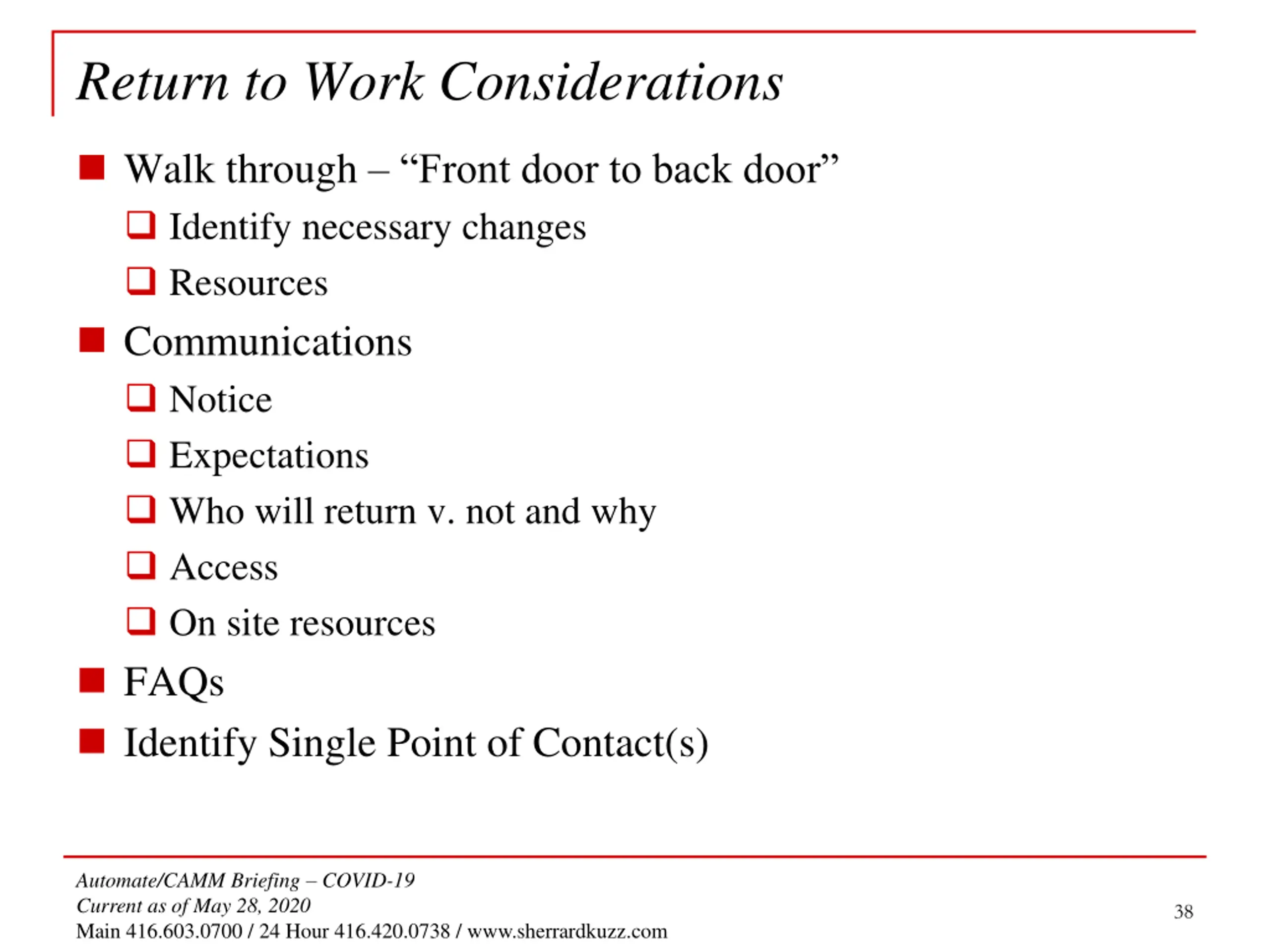 Return to Work Considerations Walk through Front door to back door Identify necessary changes Resources Communications Notice Expectations Who will return v. not and why Access On site resources FAQs Identify Single Point of Contact(s) Automate/CAMM Briefing COVID-19 Current as of May 28, 2020 Main 416.603.0700 / 24 Hour 416.420.0738 / www.sherrardkuzz.com 38