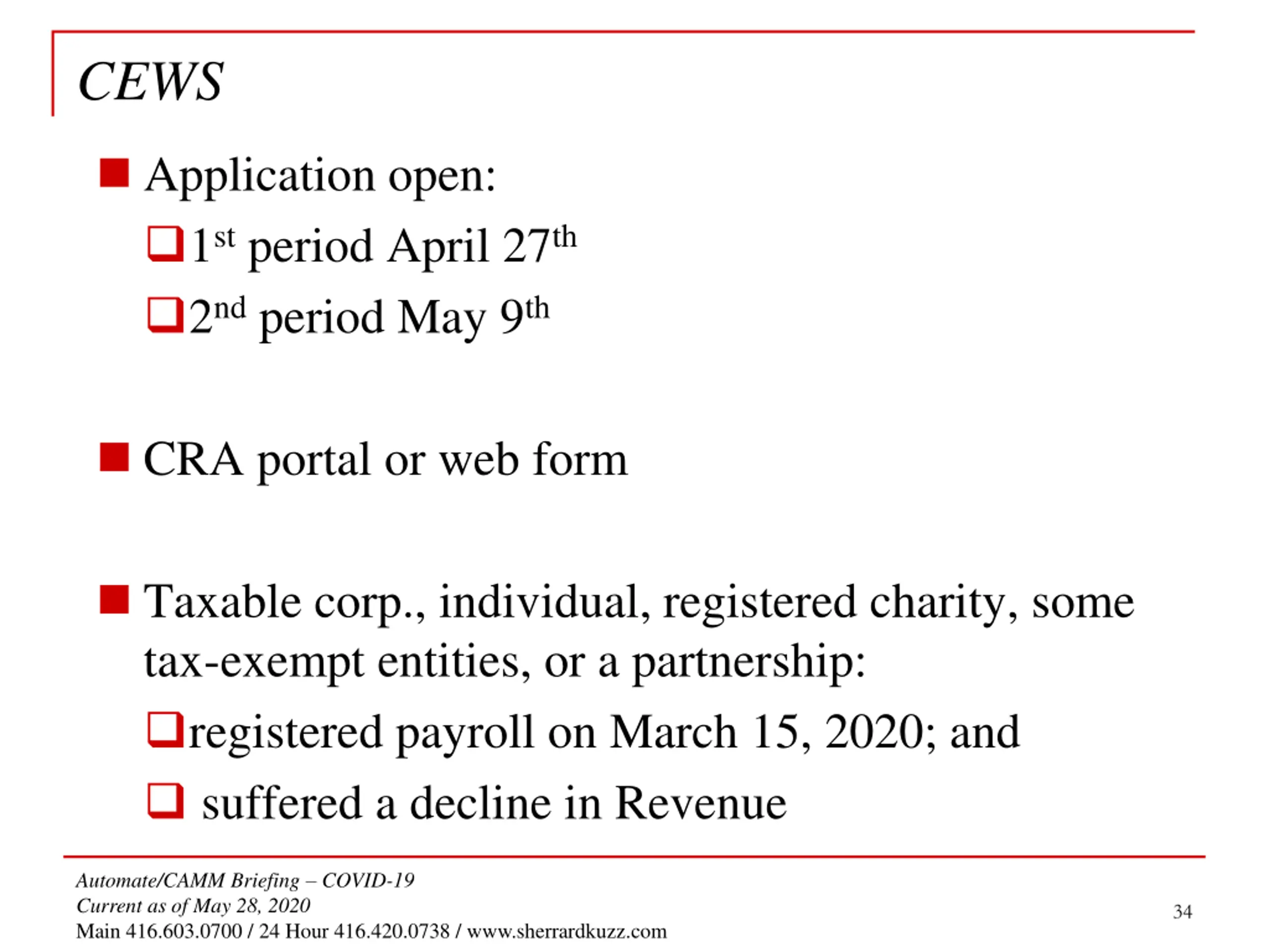 TWS & Canada Emergency Wage Subsidy (CEWS) Policy to incentivize employers to employ: 10% TWS - reduces source deductions employers remit Max of $1,375/ee up to $25,000 75% CEWS - refundable tax credit to subsidize wages Max of $847/wk or 75% of the eligible remuneration paid Three periods: (i) March 15 to April 11; (ii) April 12 to May 9; and (iii) May 10 to June 6. They are inclusive, not exclusive Automate/CAMM Briefing COVID-19 Current as of May 28, 2020 Main 416.603.0700 / 24 Hour 416.420.0738 / www.sherrardkuzz.com 33