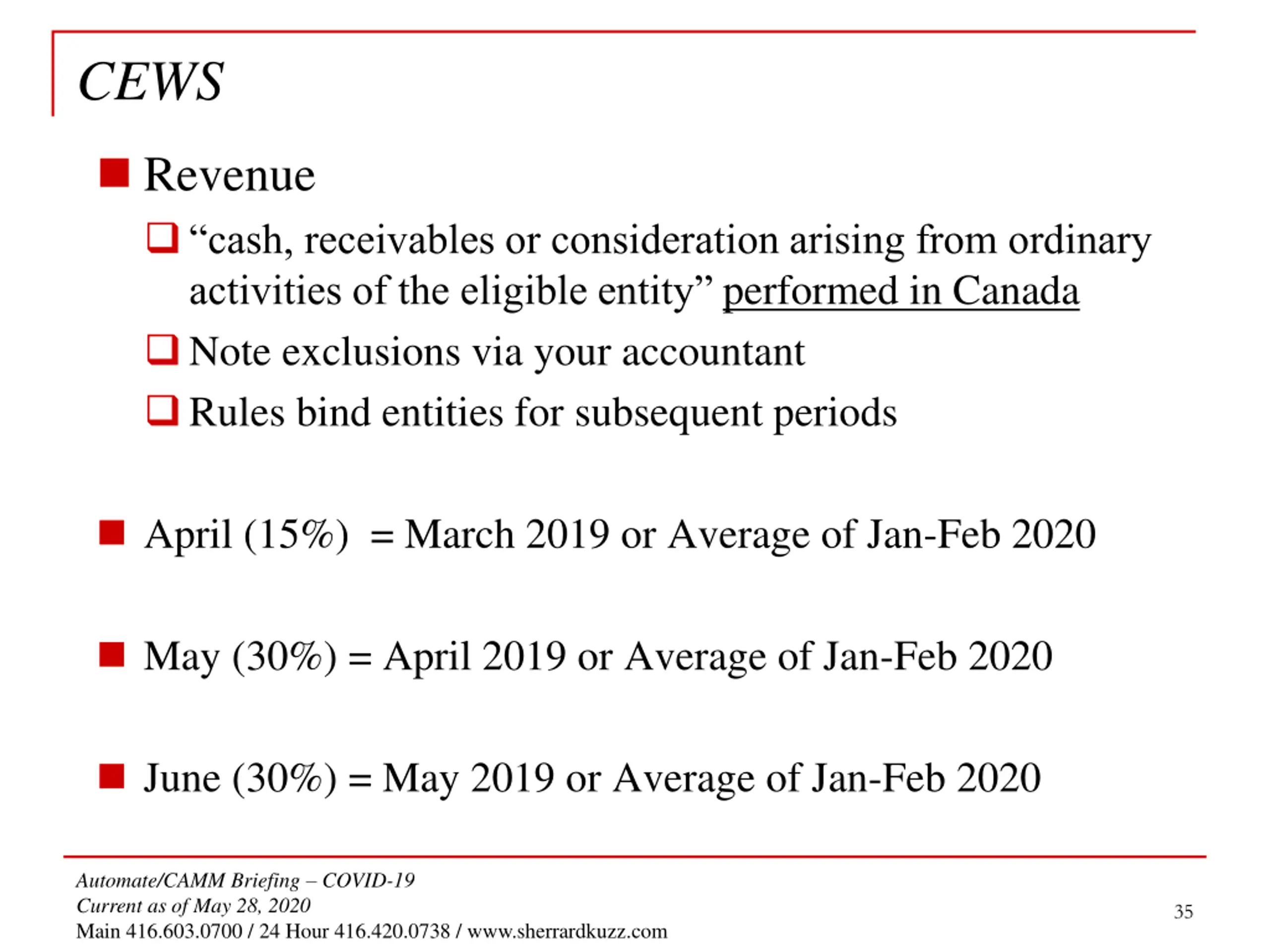 CEWS Application open: 1st period April 27th 2nd period May 9th CRA portal or web form Taxable corp., individual, registered charity, some tax-exempt entities, or a partnership: registered payroll on March 15, 2020; and suffered a decline in Revenue Automate/CAMM Briefing COVID-19 Current as of May 28, 2020 Main 416.603.0700 / 24 Hour 416.420.0738 / www.sherrardkuzz.com 34