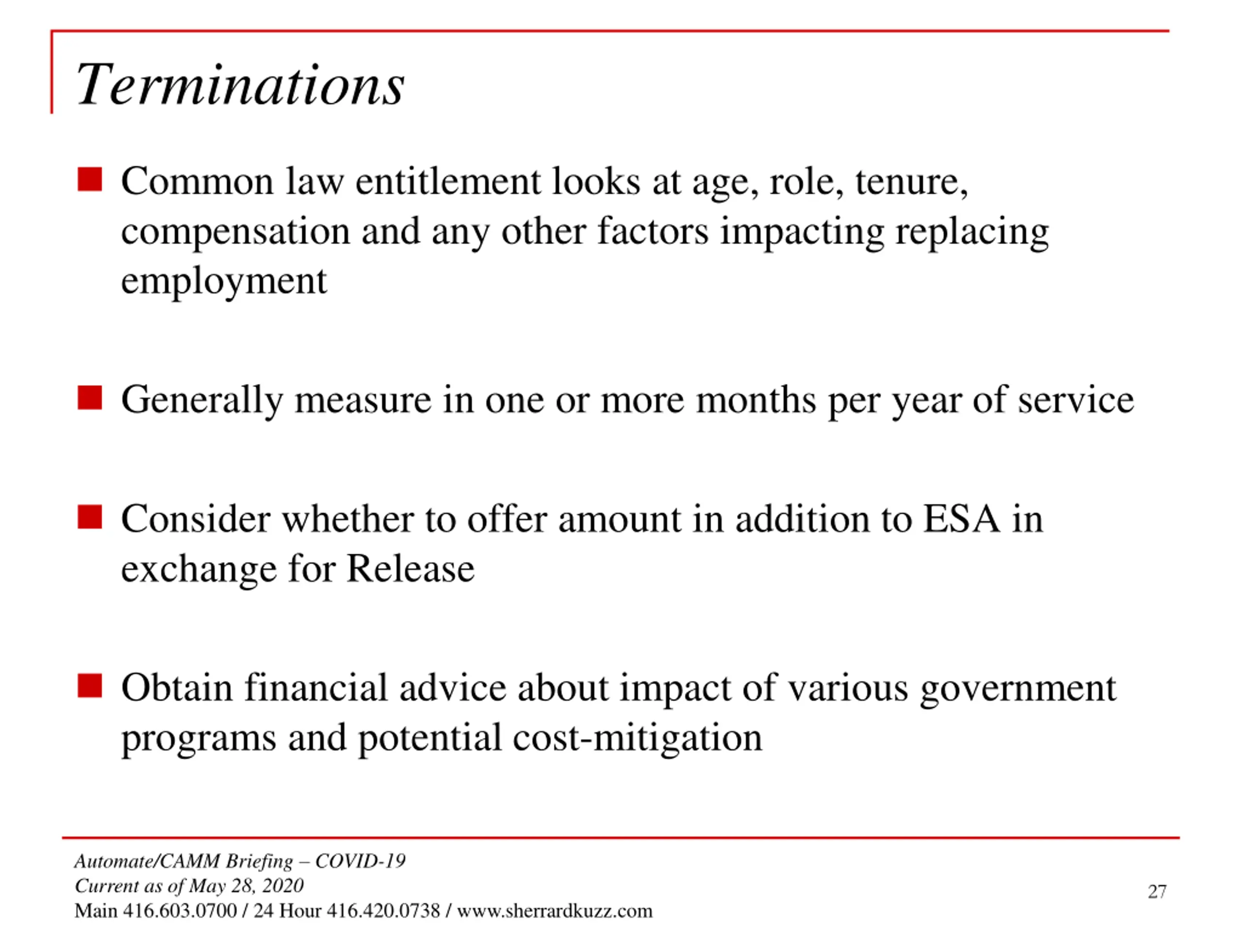 Terminations Ensure selection of candidates defensible and not related to a protected ground (age, disability, etc.) Review any employment agreement for termination language Seek advice re: enforceability Must consider not only ESA but common law entitlements Automate/CAMM Briefing COVID-19 Current as of May 28, 2020 Main 416.603.0700 / 24 Hour 416.420.0738 / www.sherrardkuzz.com 26