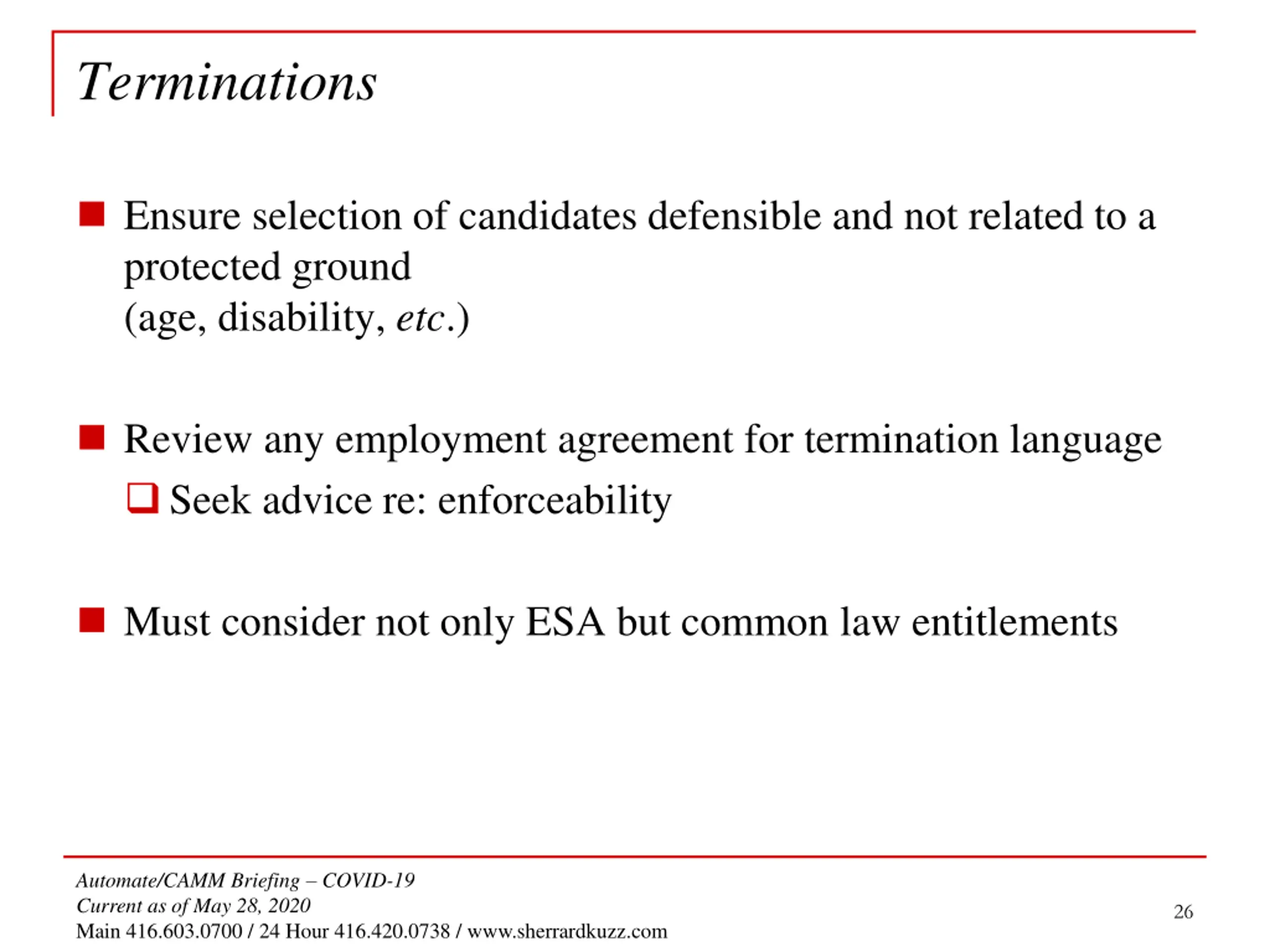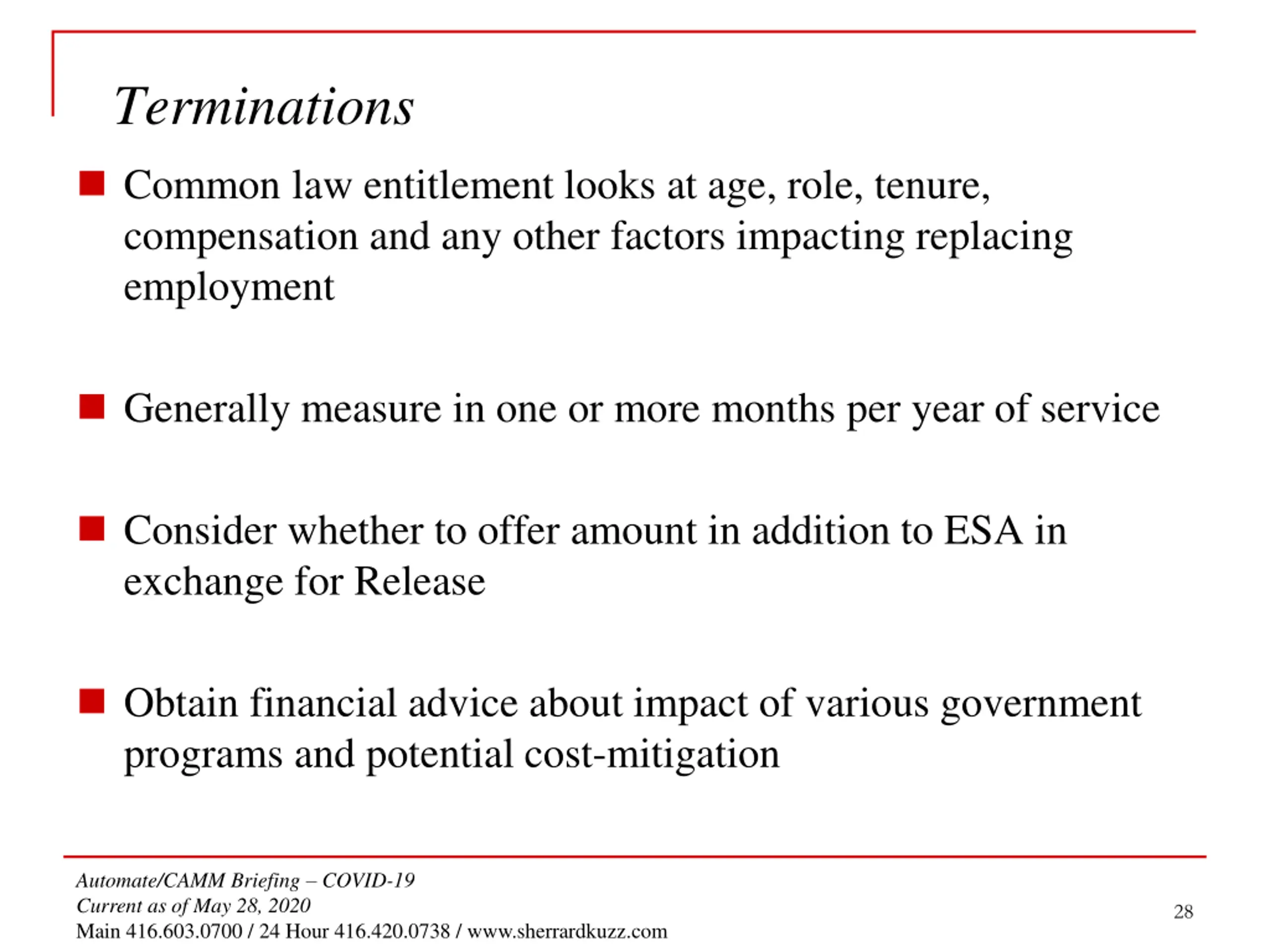 Terminations Common law entitlement looks at age, role, tenure, compensation and any other factors impacting replacing employment Generally measure in one or more months per year of service Consider whether to offer amount in addition to ESA in exchange for Release Obtain financial advice about impact of various government programs and potential cost-mitigation Automate/CAMM Briefing COVID-19 Current as of May 28, 2020 Main 416.603.0700 / 24 Hour 416.420.0738 / www.sherrardkuzz.com 27