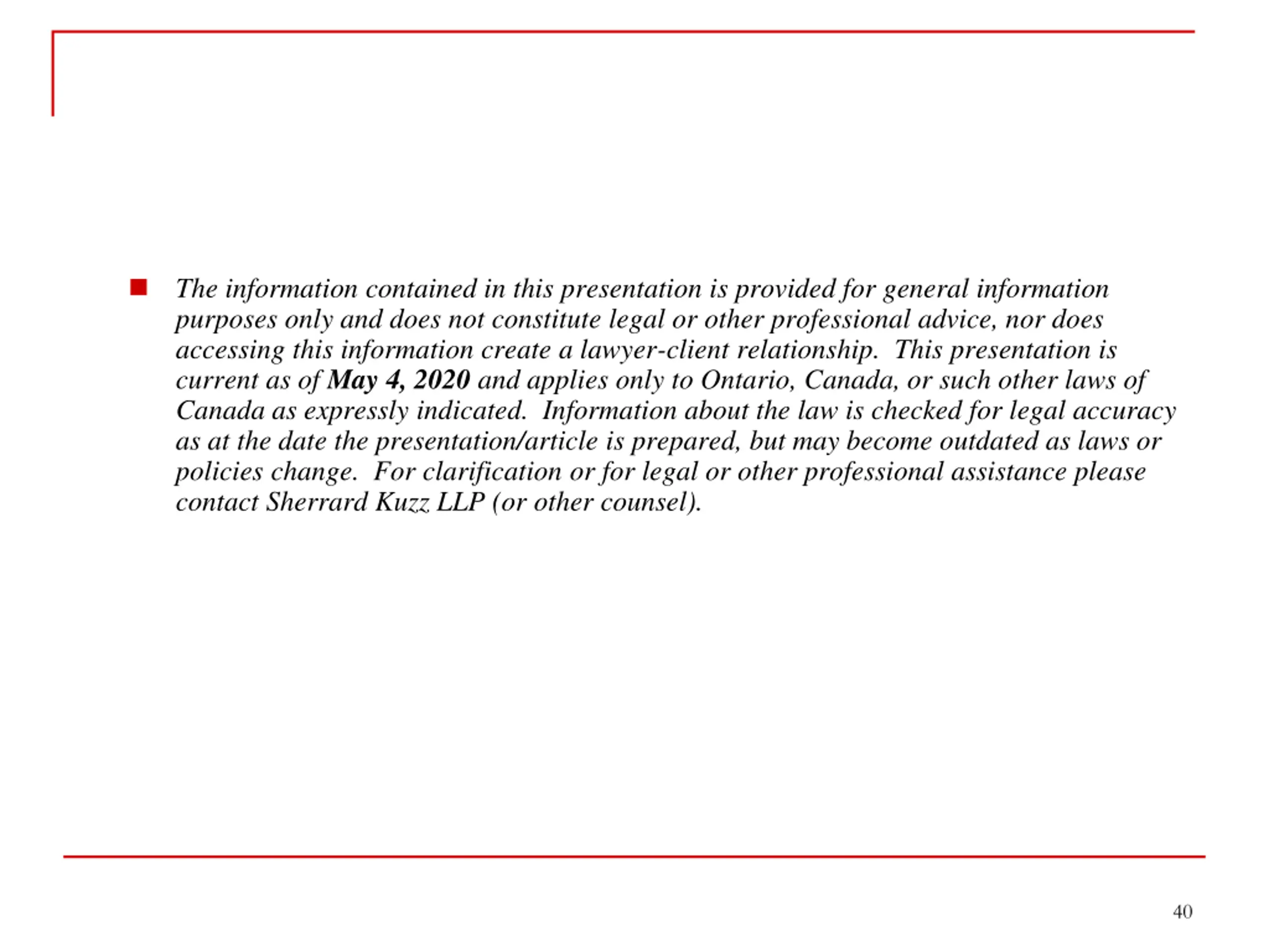The information contained in this presentation is provided for general information purposes only and does not constitute legal or other professional advice, nor does accessing this information create a lawyer-client relationship. This presentation is current as of May 4, 2020 and applies only to Ontario, Canada, or such other laws of Canada as expressly indicated. Information about the law is checked for legal accuracy as at the date the presentation/article is prepared, but may become outdated as laws or policies change. For clarification or for legal or other professional assistance please contact Sherrard Kuzz LLP (or other counsel). 40