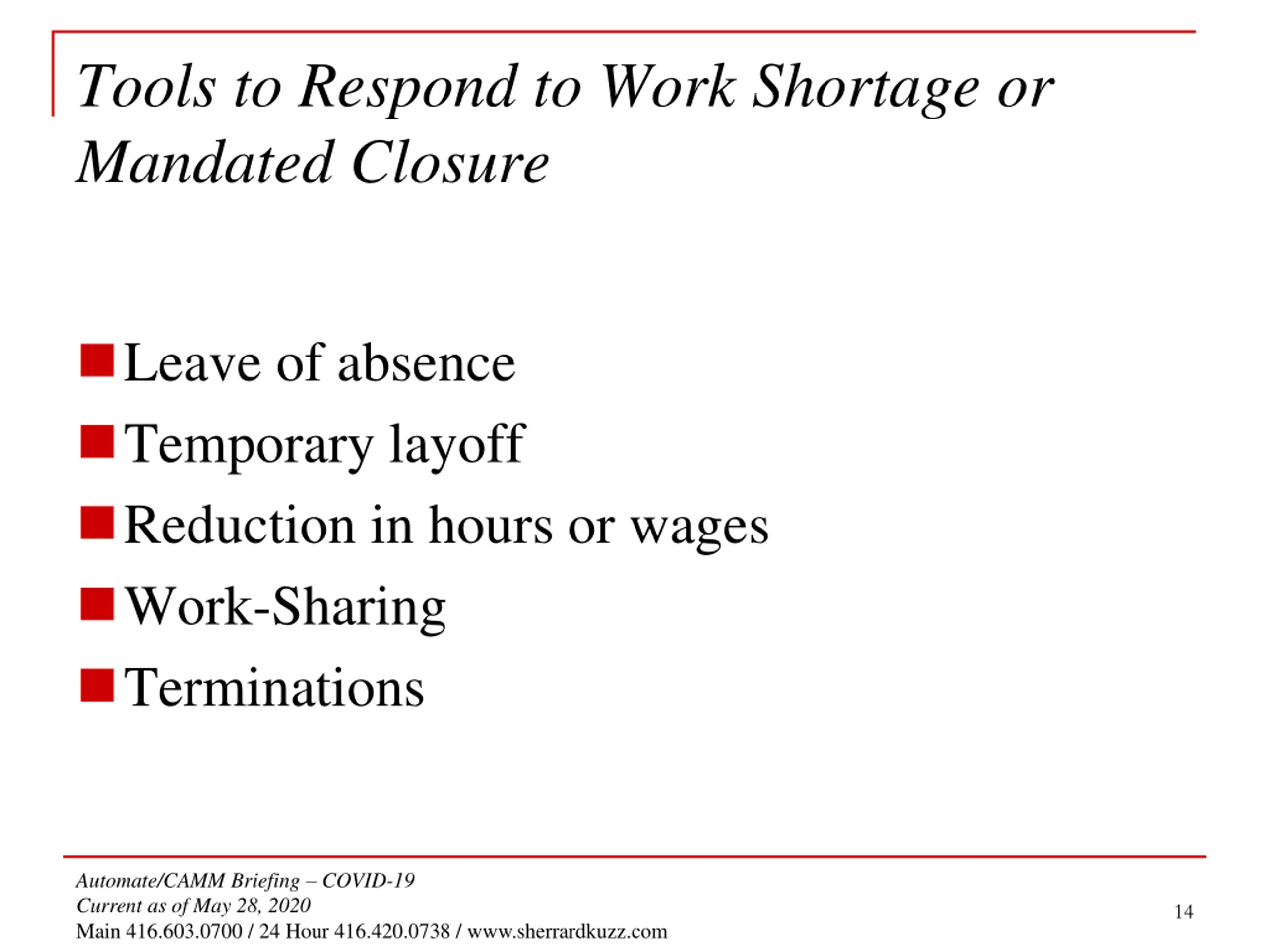 Tools to Respond to Work Shortage or Mandated Closure Leave of absence Temporary layoff Reduction in hours or wages Work-Sharing Terminations Automate/CAMM Briefing COVID-19 Current as of May 28, 2020 Main 416.603.0700 / 24 Hour 416.420.0738 / www.sherrardkuzz.com 14