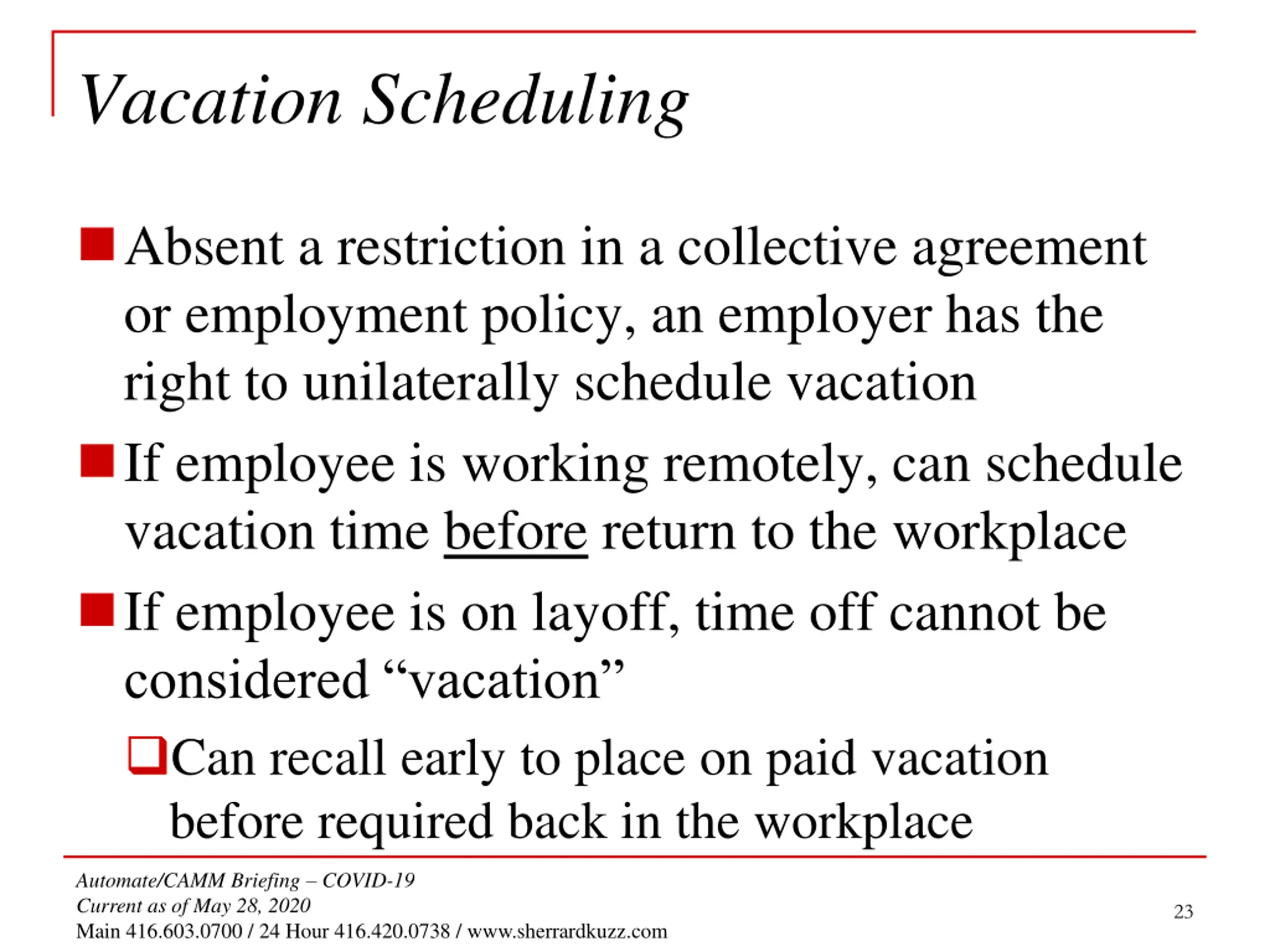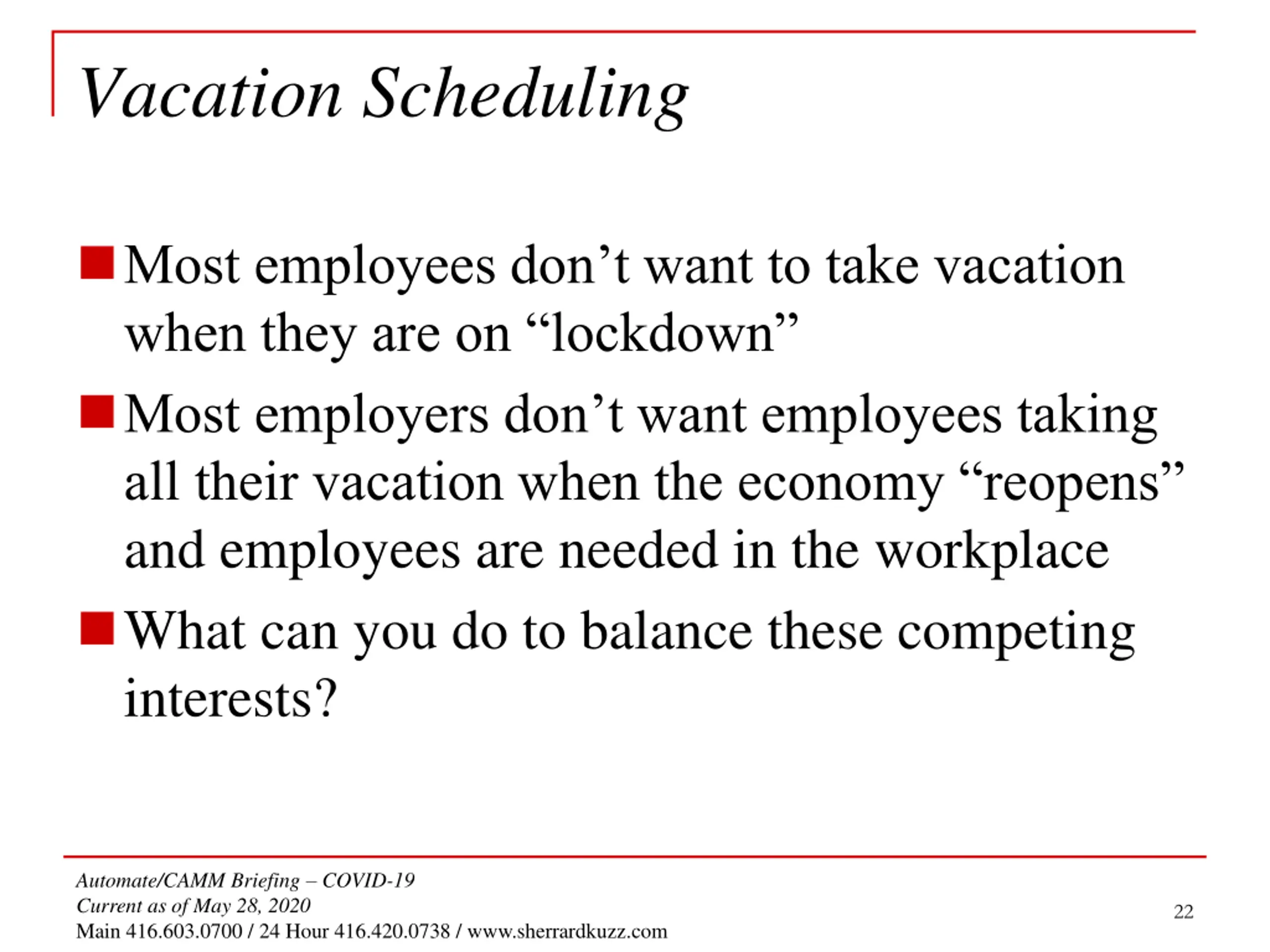 Vacation Scheduling Most employees don t want to take vacation when they are on lockdown Most employers don t want employees taking all their vacation when the economy reopens and employees are needed in the workplace What can you do to balance these competing interests? Automate/CAMM Briefing COVID-19 Current as of May 28, 2020 Main 416.603.0700 / 24 Hour 416.420.0738 / www.sherrardkuzz.com 22