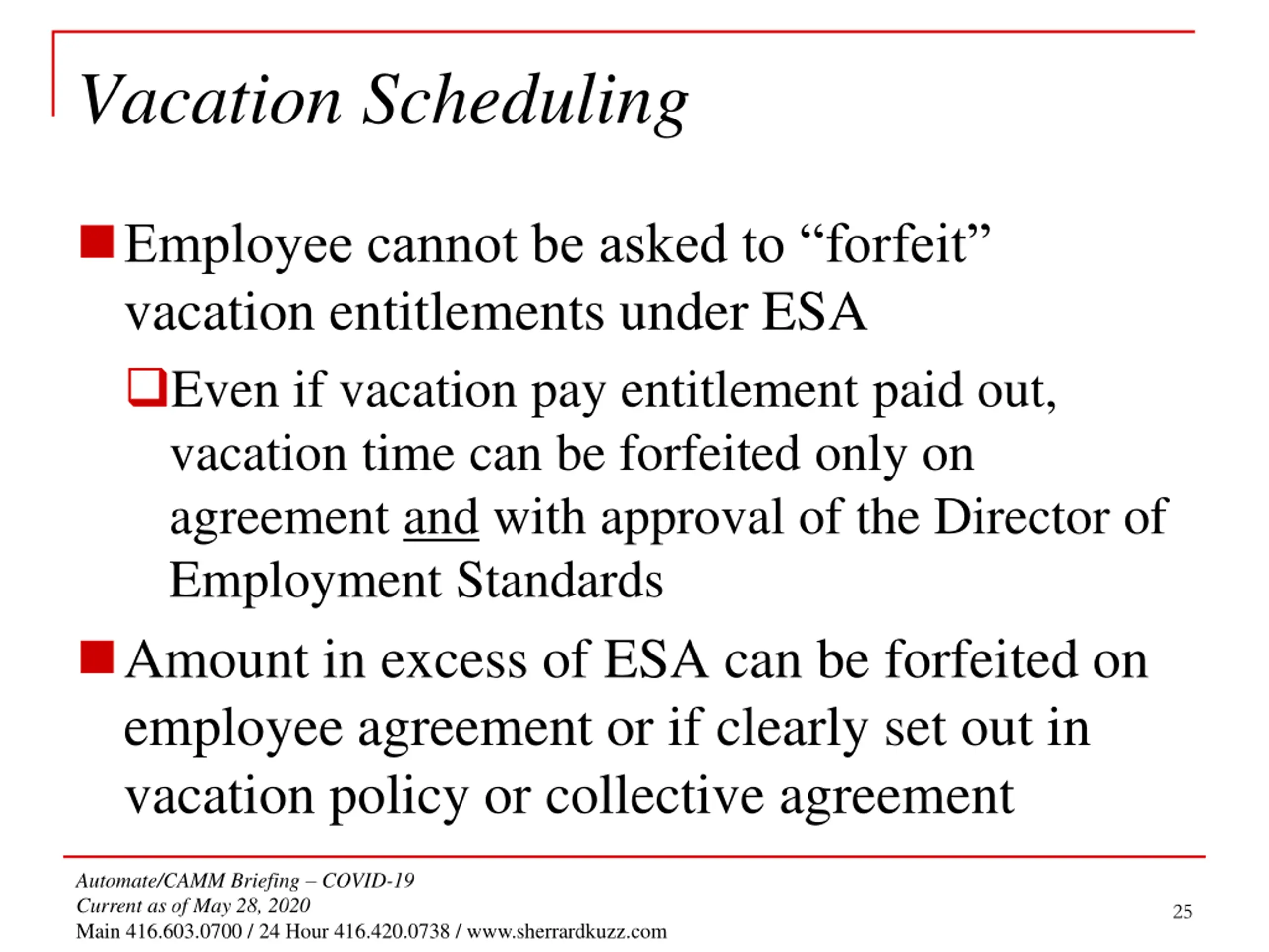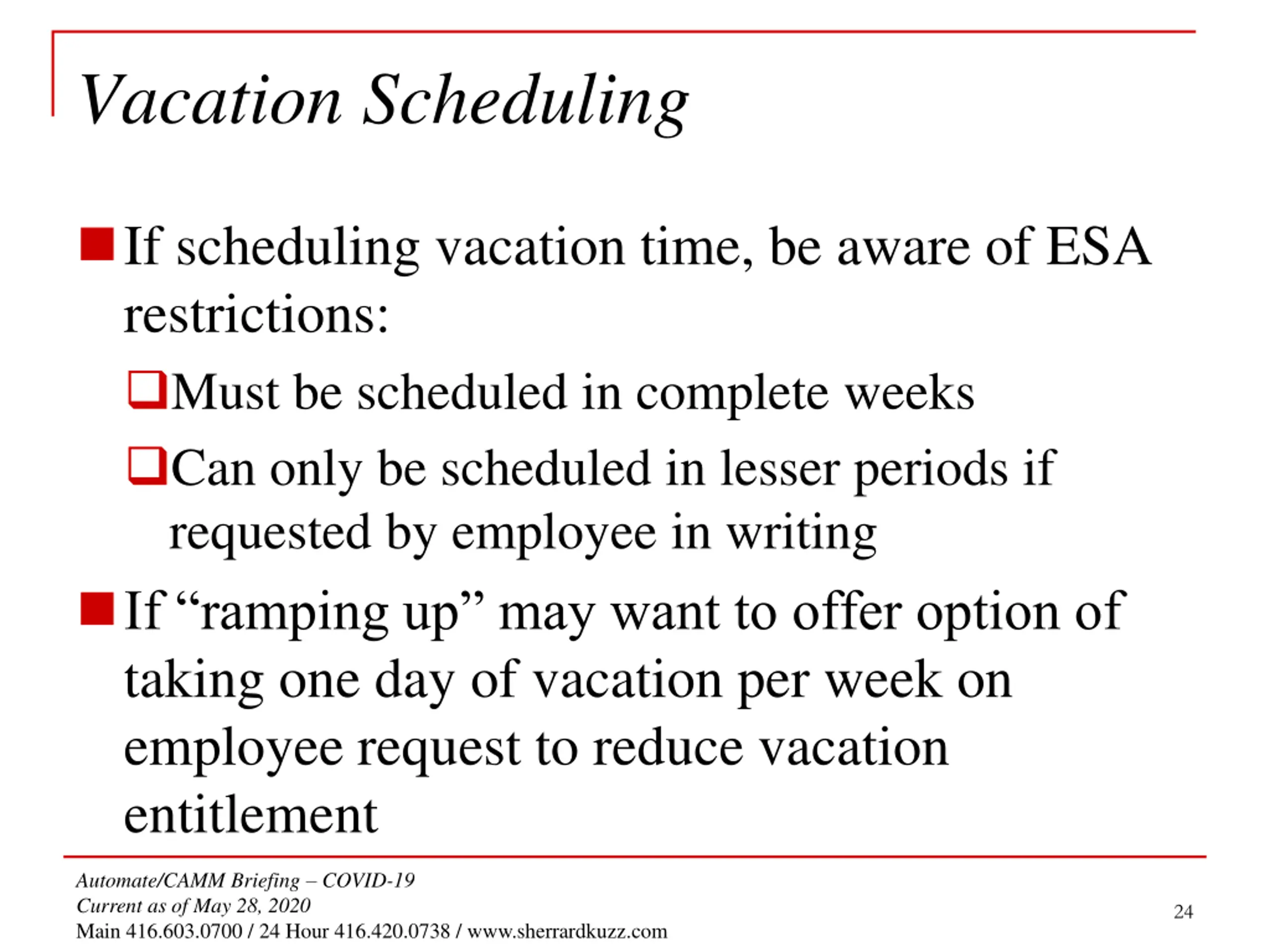 Vacation Scheduling If scheduling vacation time, be aware of ESA restrictions: Must be scheduled in complete weeks Can only be scheduled in lesser periods if requested by employee in writing If ramping up may want to offer option of taking one day of vacation per week on employee request to reduce vacation entitlement Automate/CAMM Briefing COVID-19 Current as of May 28, 2020 Main 416.603.0700 / 24 Hour 416.420.0738 / www.sherrardkuzz.com 24