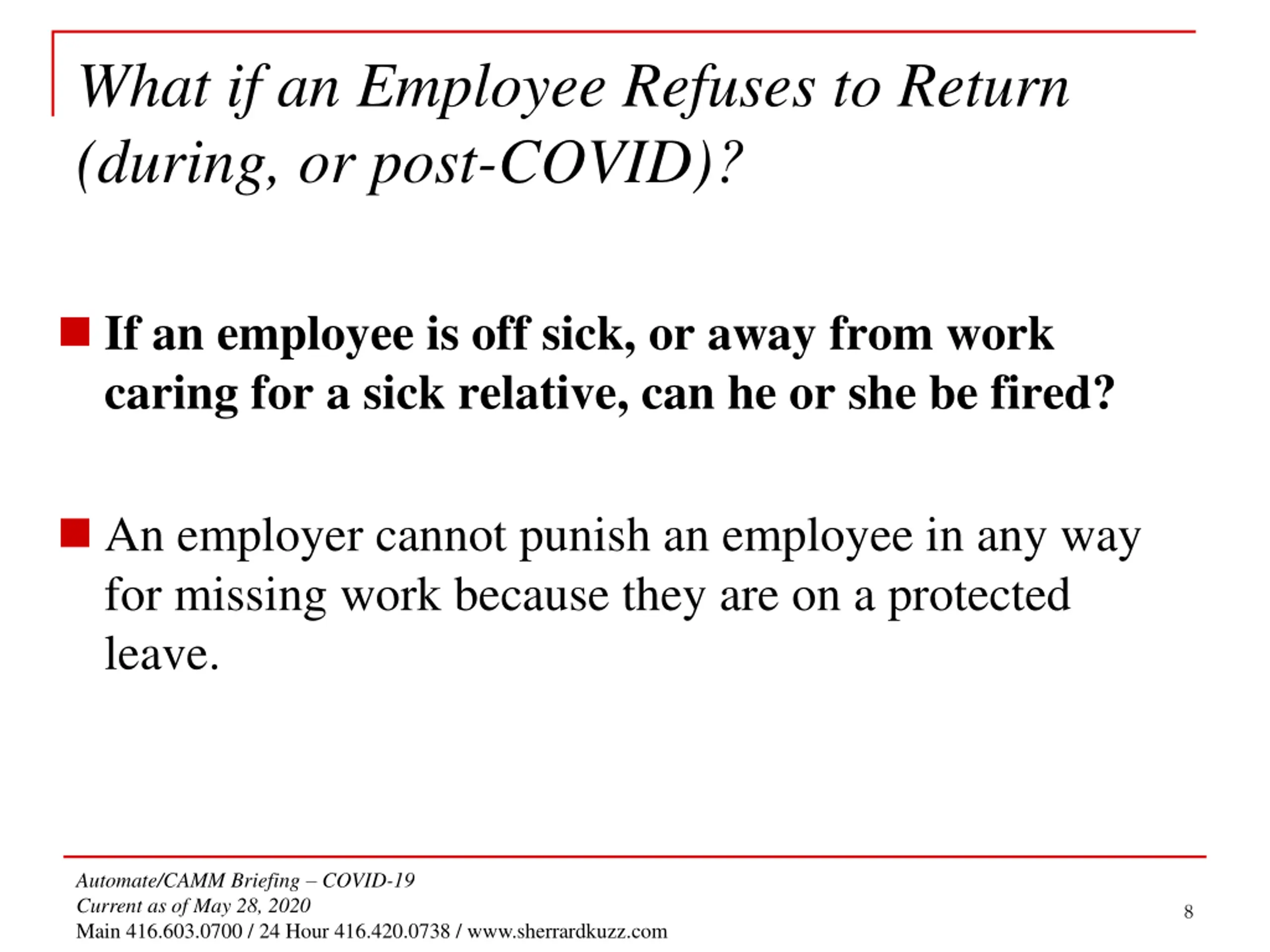 What if an Employee Refuses to Return (during, or post-COVID)? Are there protected leaves for which employee may qualify? If so, have they requested a leave? If no request made, may technically require return to work, but may be better to suggest they put in a leave request Automate/CAMM Briefing COVID-19 Current as of May 28, 2020 Main 416.603.0700 / 24 Hour 416.420.0738 / www.sherrardkuzz.com 7