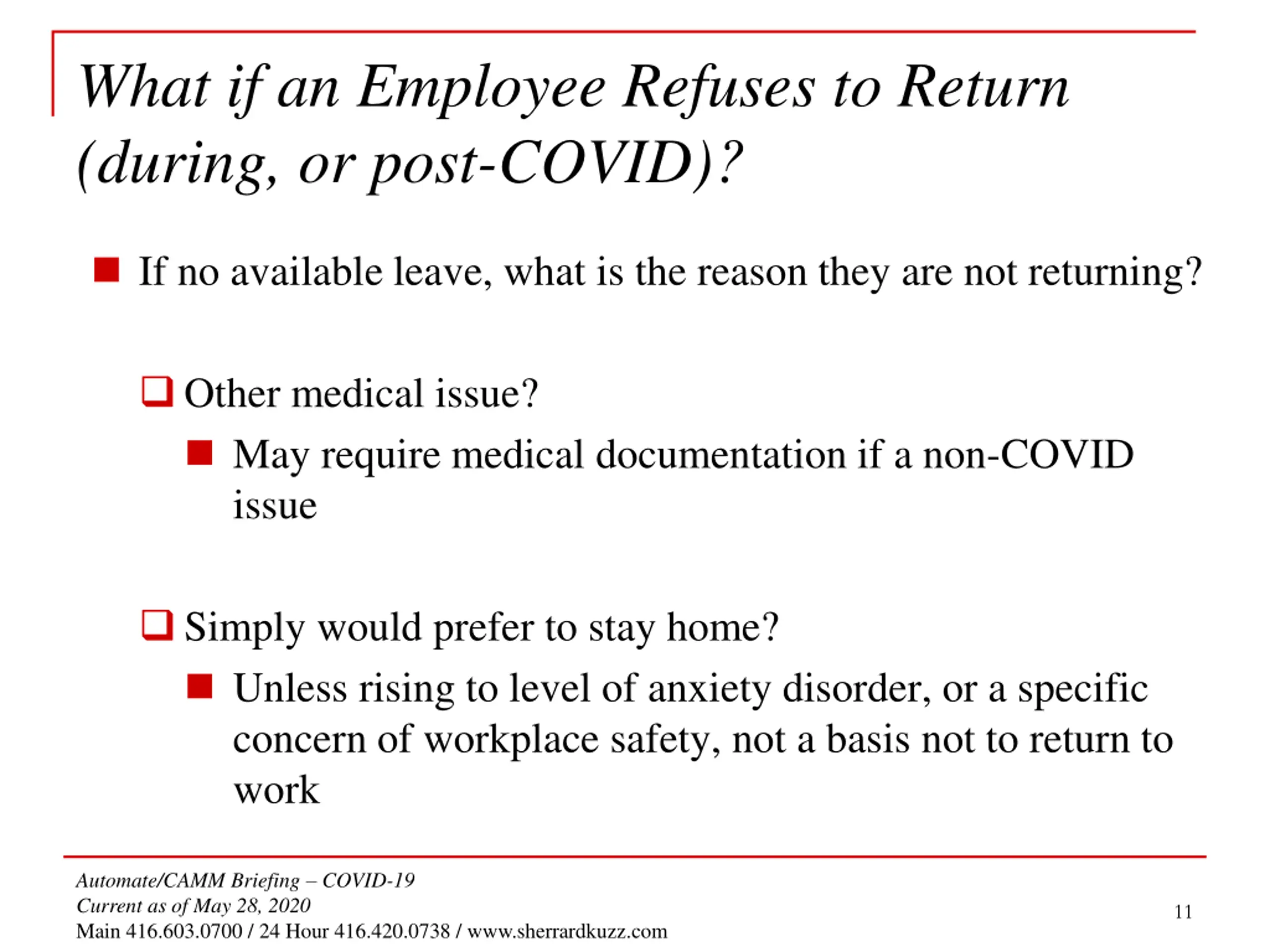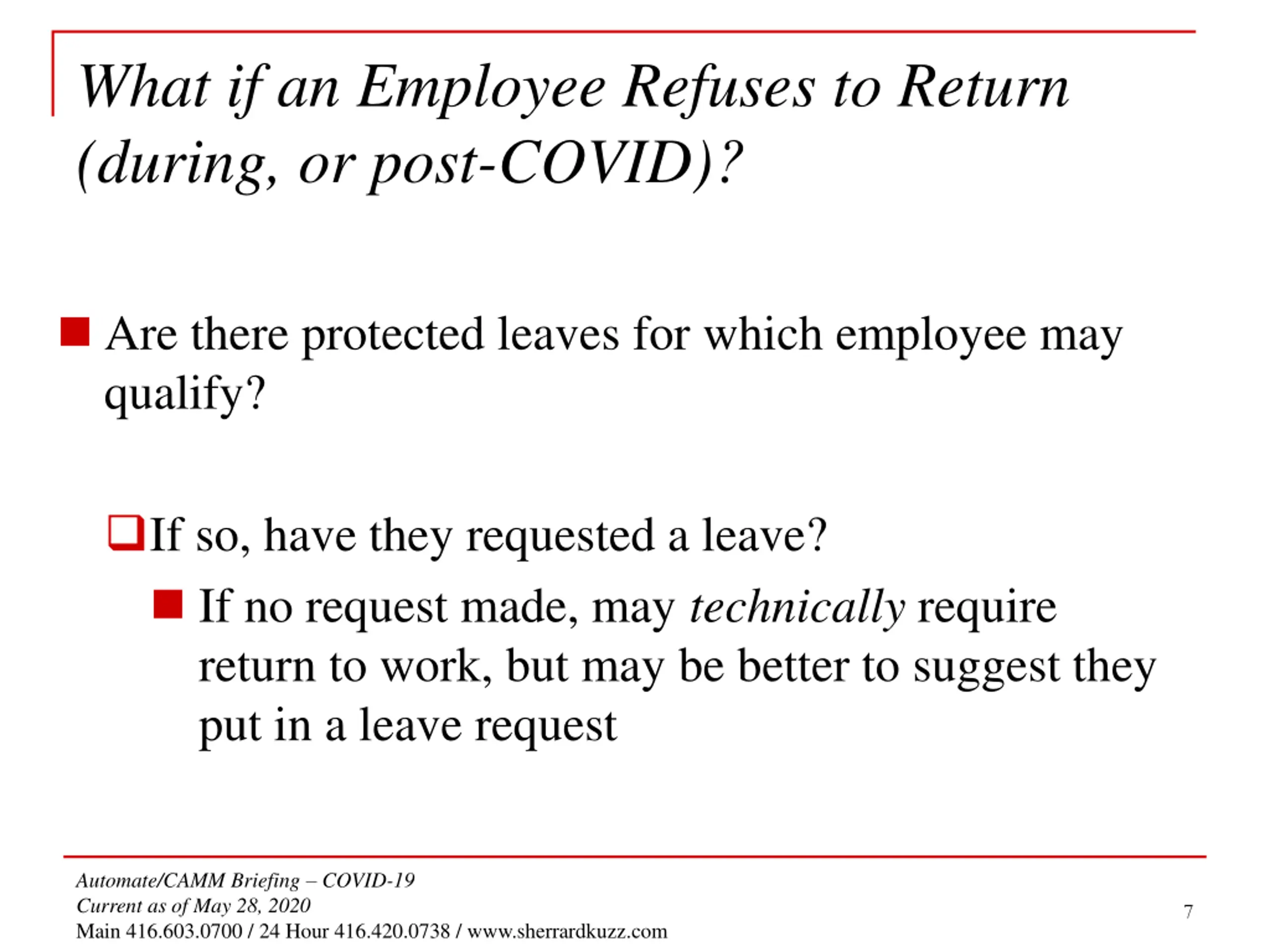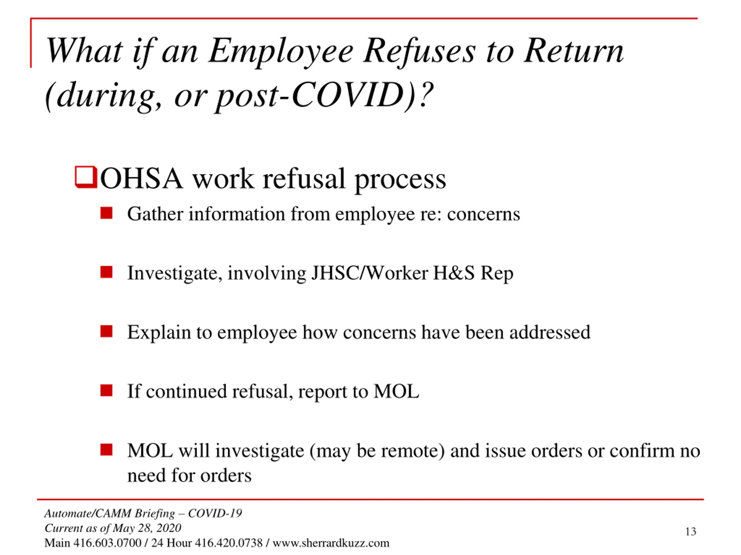 What if an Employee Refuses to Return (during, or post-COVID)? Specific concerns about workplace safety? Is the employee exempt from OHSA work refusals (risk at issue is inherent in the work or refusal would endanger someone else)? If yes, no right to refuse If no, ask employee to clarify basis of concern, preferably in writing (but cannot mandate) If related to workplace, OHSA work refusal Automate/CAMM Briefing COVID-19 Current as of May 28, 2020 Main 416.603.0700 / 24 Hour 416.420.0738 / www.sherrardkuzz.com 12