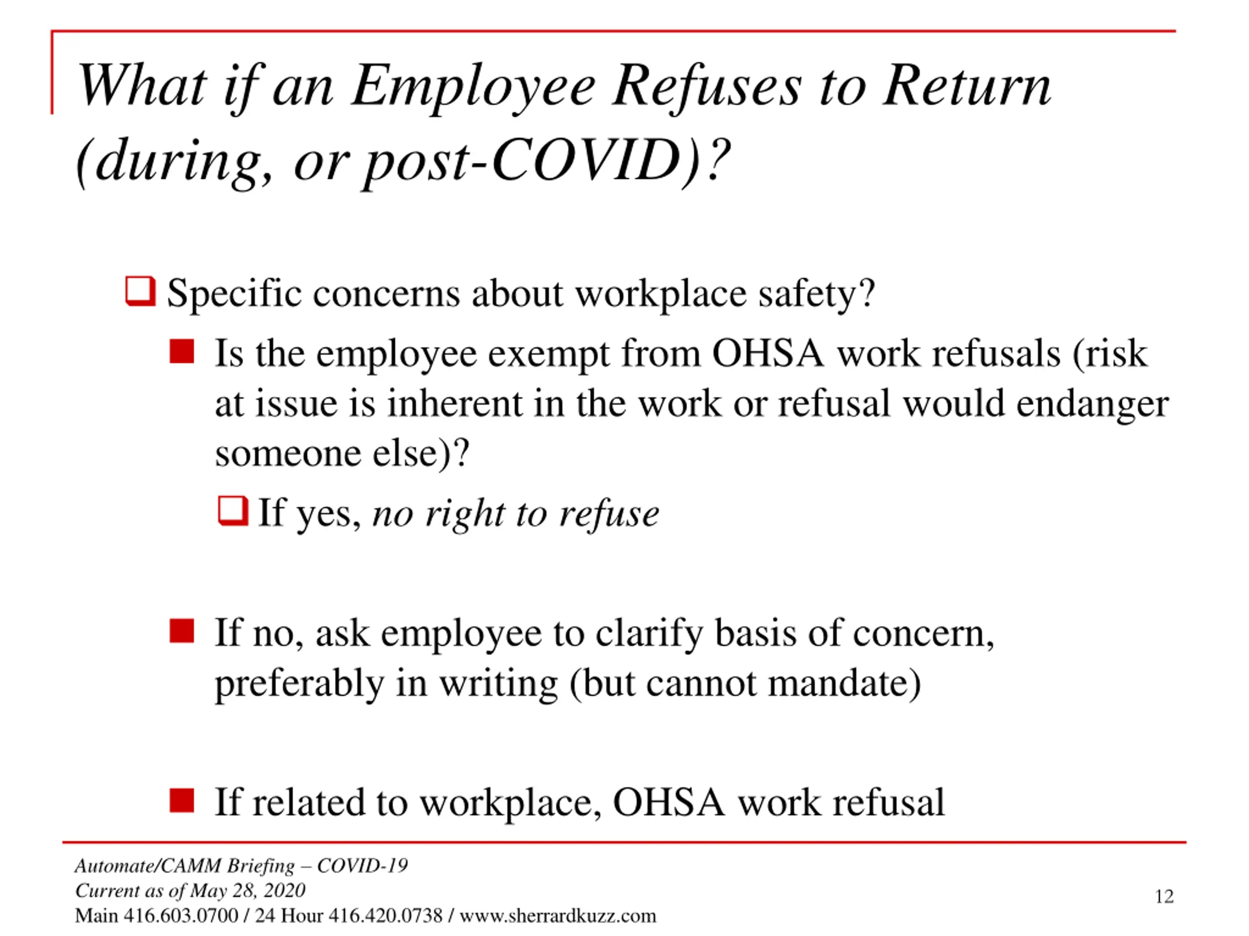 What if an Employee Refuses to Return (during, or post-COVID)? If no available leave, what is the reason they are not returning? Other medical issue? May require medical documentation if a non-COVID issue Simply would prefer to stay home? Unless rising to level of anxiety disorder, or a specific concern of workplace safety, not a basis not to return to work Automate/CAMM Briefing COVID-19 Current as of May 28, 2020 Main 416.603.0700 / 24 Hour 416.420.0738 / www.sherrardkuzz.com 11