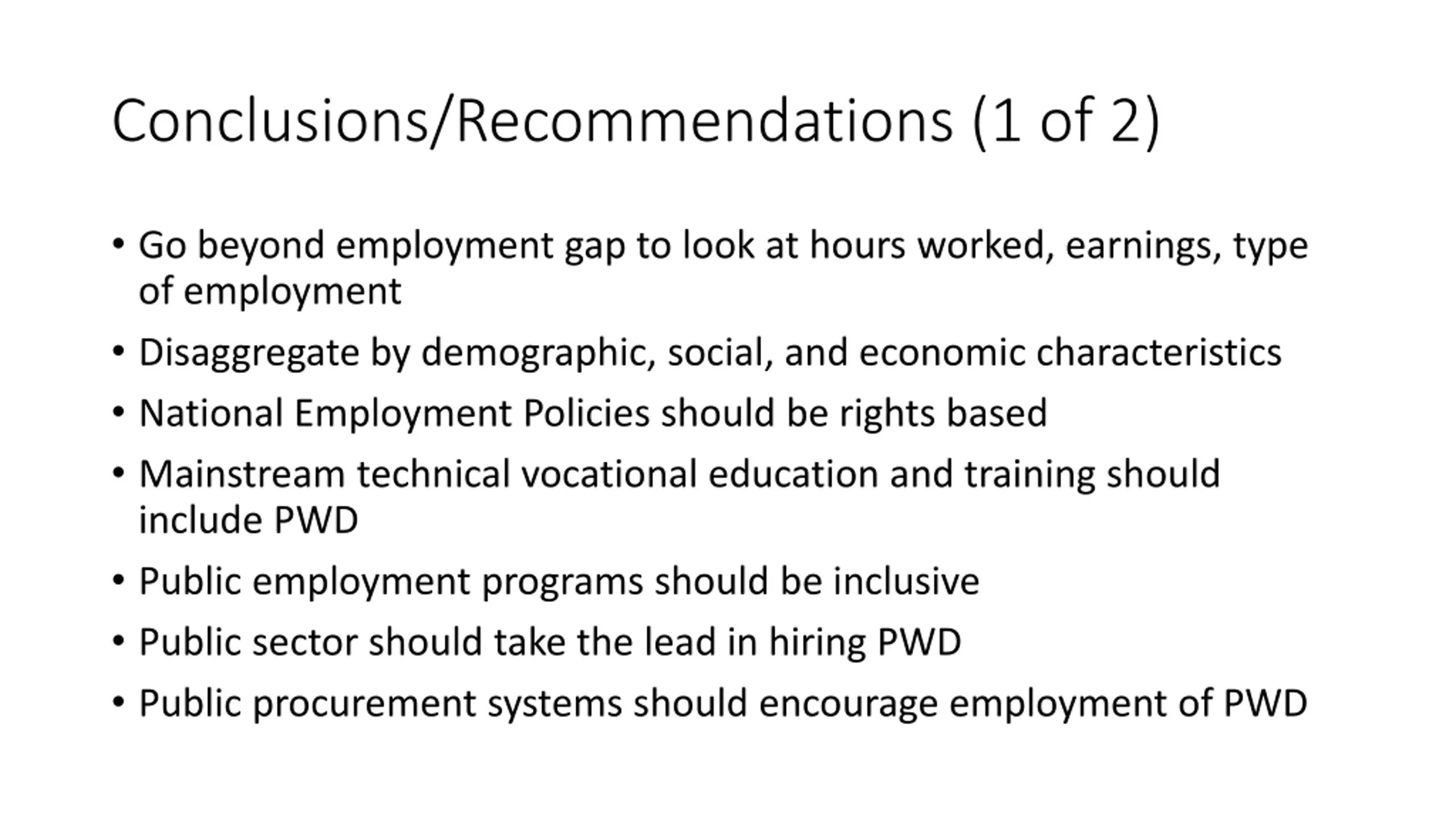 Conclusions/Recommendations (1 of 2) Go beyond employment gap to look at hours worked, earnings, type of employment Disaggregate by demographic, social, and economic characteristics National Employment Policies should be rights based Mainstream technical vocational education and training should include PWD Public employment programs should be inclusive Public sector should take the lead in hiring PWD Public procurement systems should encourage employment of PWD