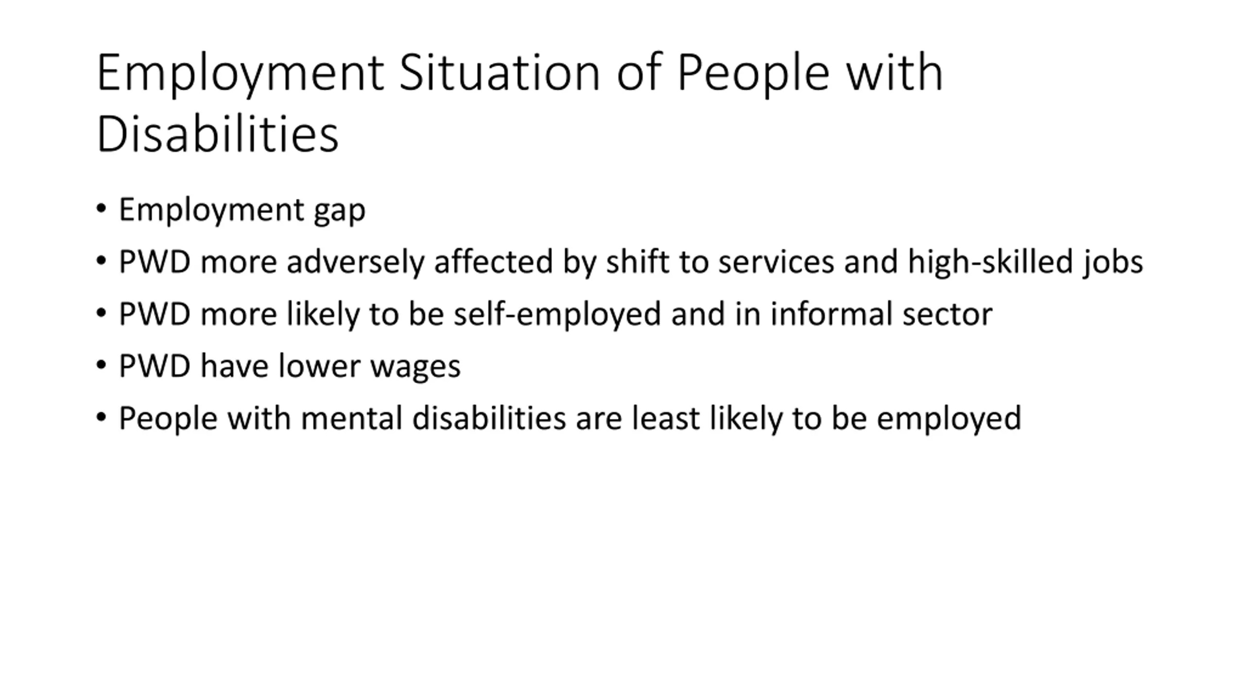Employment Situation of People with Disabilities Employment gap PWD more adversely affected by shift to services and high-skilled jobs PWD more likely to be self-employed and in informal sector PWD have lower wages People with mental disabilities are least likely to be employed