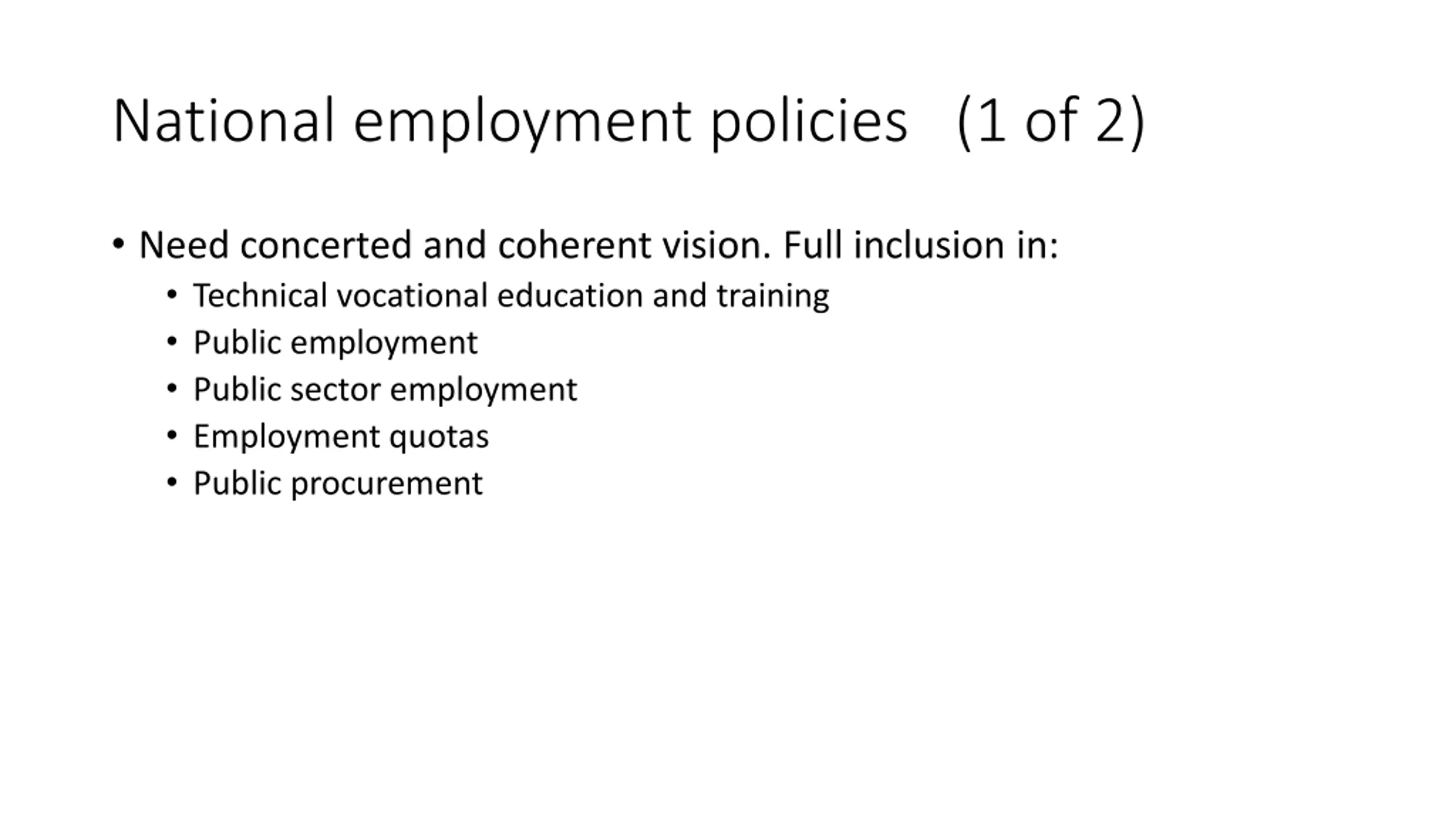National employment policies (1 of 2) Need concerted and coherent vision. Full inclusion in: Technical vocational education and training Public employment Public sector employment Employment quotas Public procurement