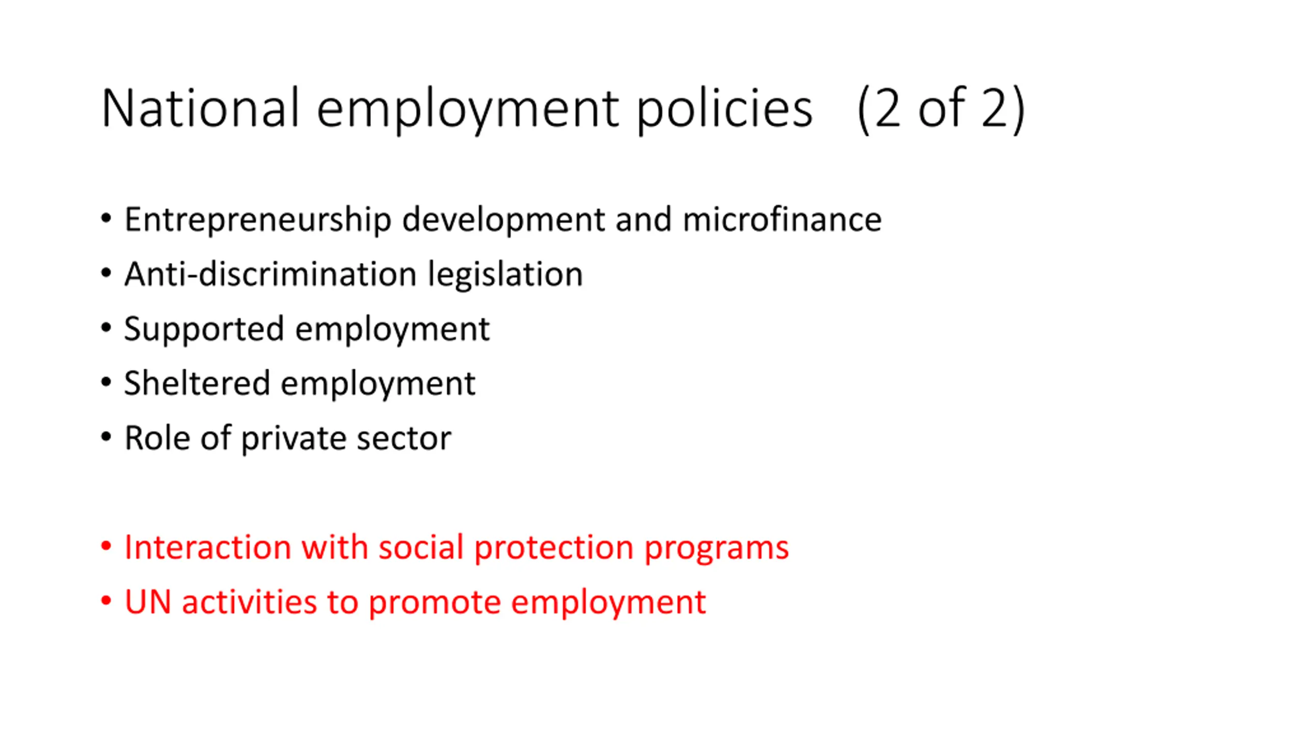 National employment policies (2 of 2) Entrepreneurship development and microfinance Anti-discrimination legislation Supported employment Sheltered employment Role of private sector Interaction with social protection programs UN activities to promote employment