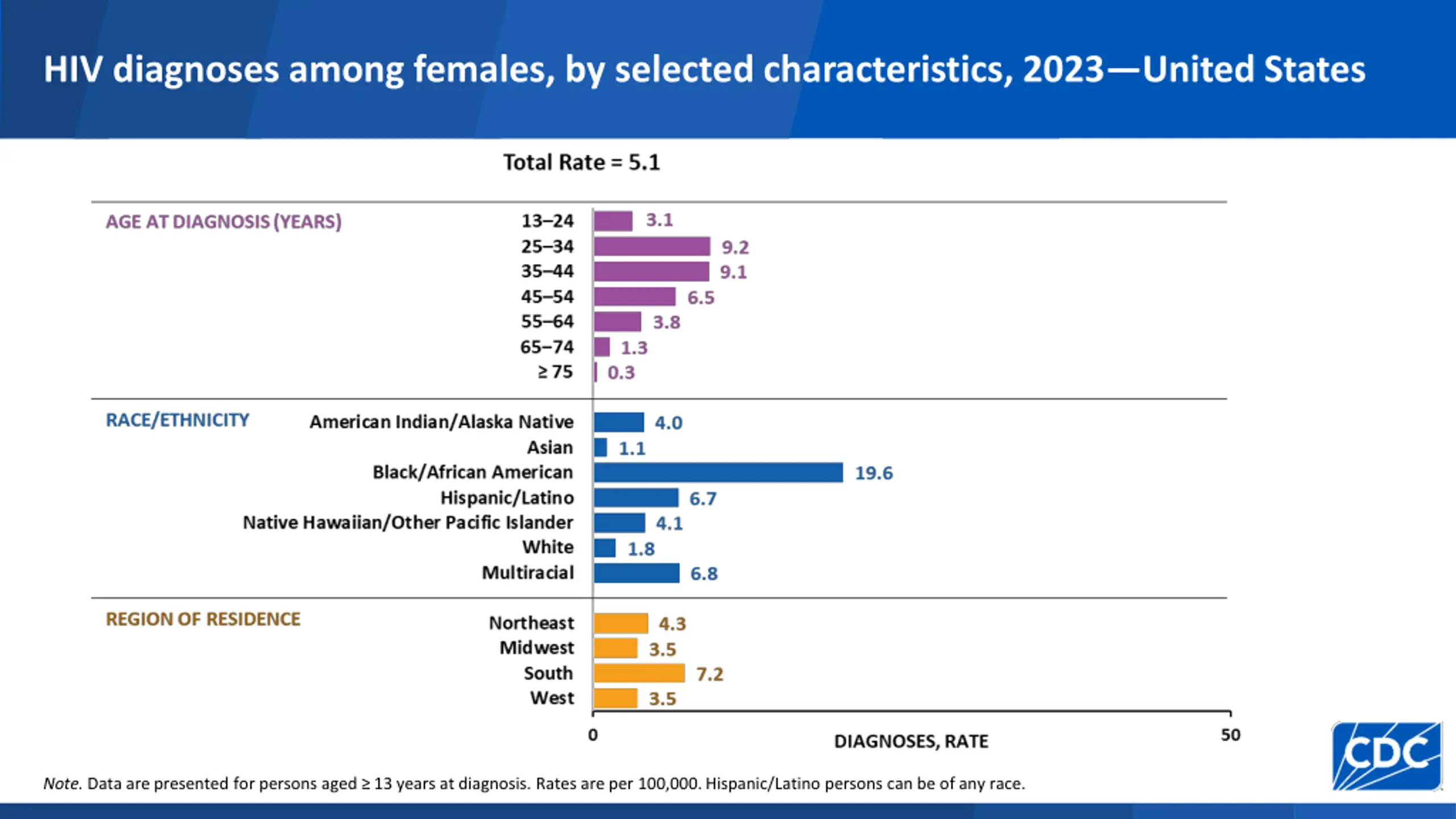HIV diagnoses among females, by selected characteristics, 2023United States Note. Data are presented for persons aged 13 years at diagnosis. Rates are per 100,000. Hispanic/Latino persons can be of any race.