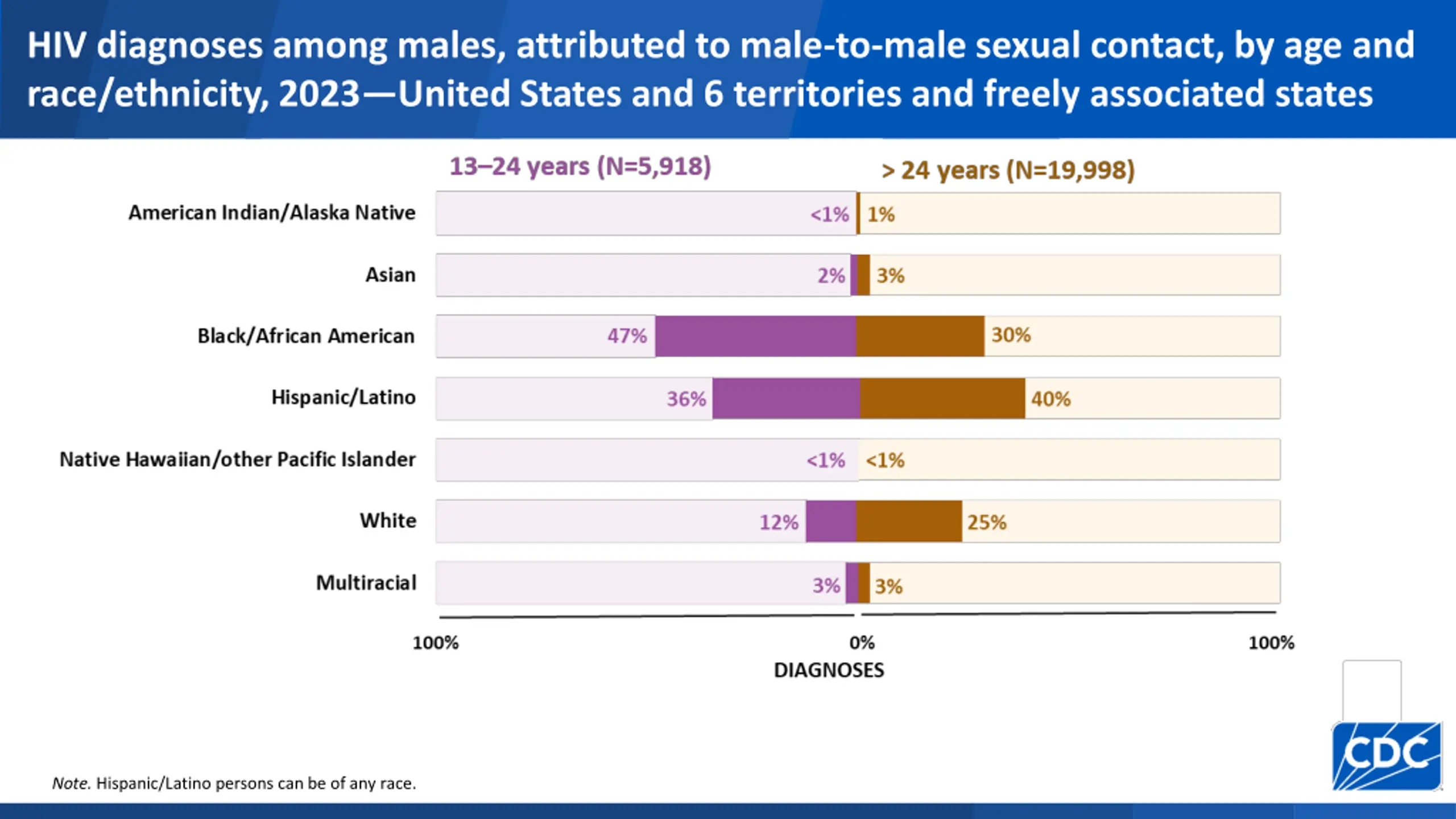 HIV diagnoses among males, attributed to male-to-male sexual contact, by age and race/ethnicity, 2023 United States and 6 territories and freely associated states Note. Hispanic/Latino persons can be of any race.