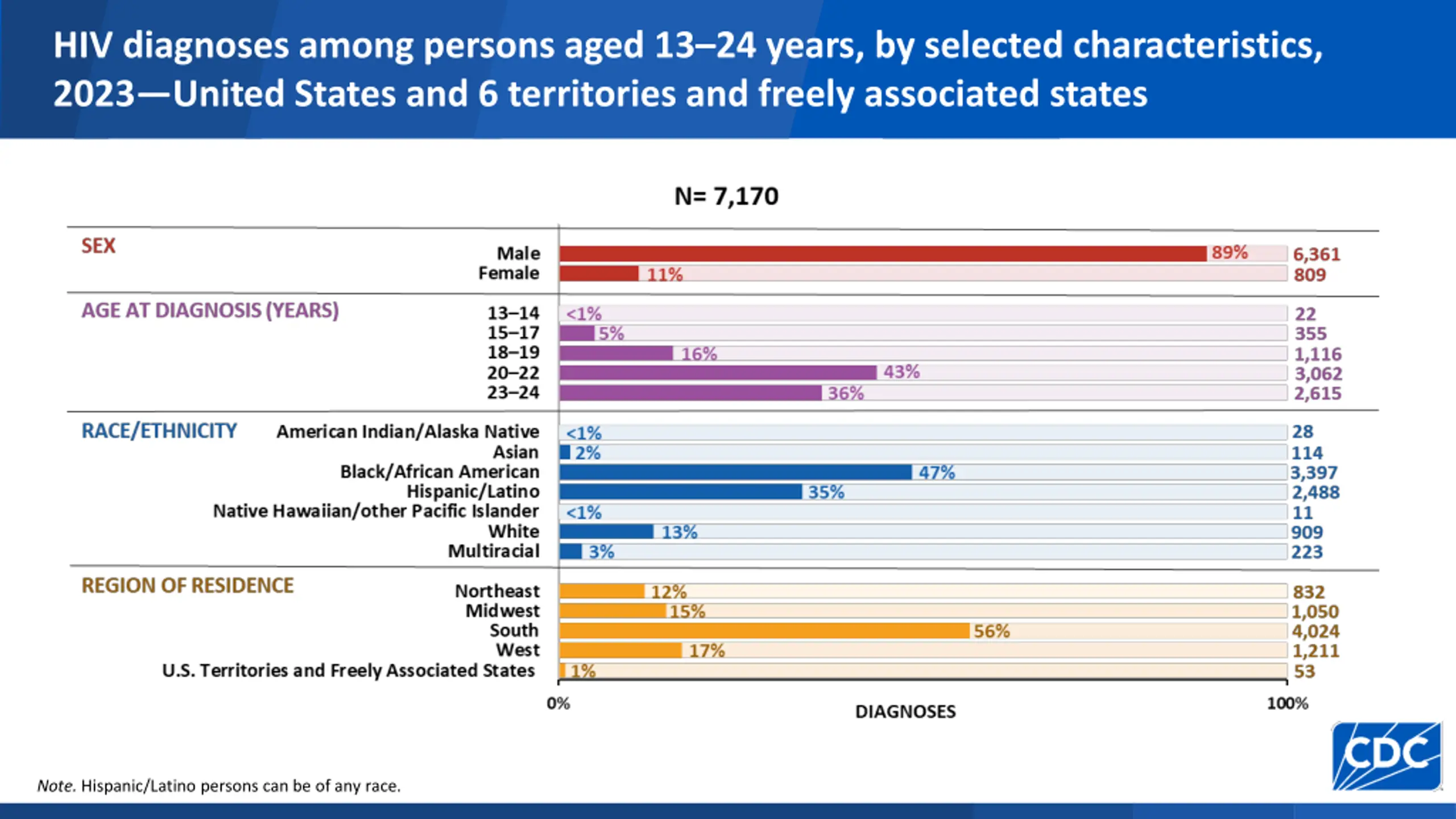HIV diagnoses among persons aged 1324 years, by selected characteristics, 2023 United States and 6 territories and freely associated states Note. Hispanic/Latino persons can be of any race.