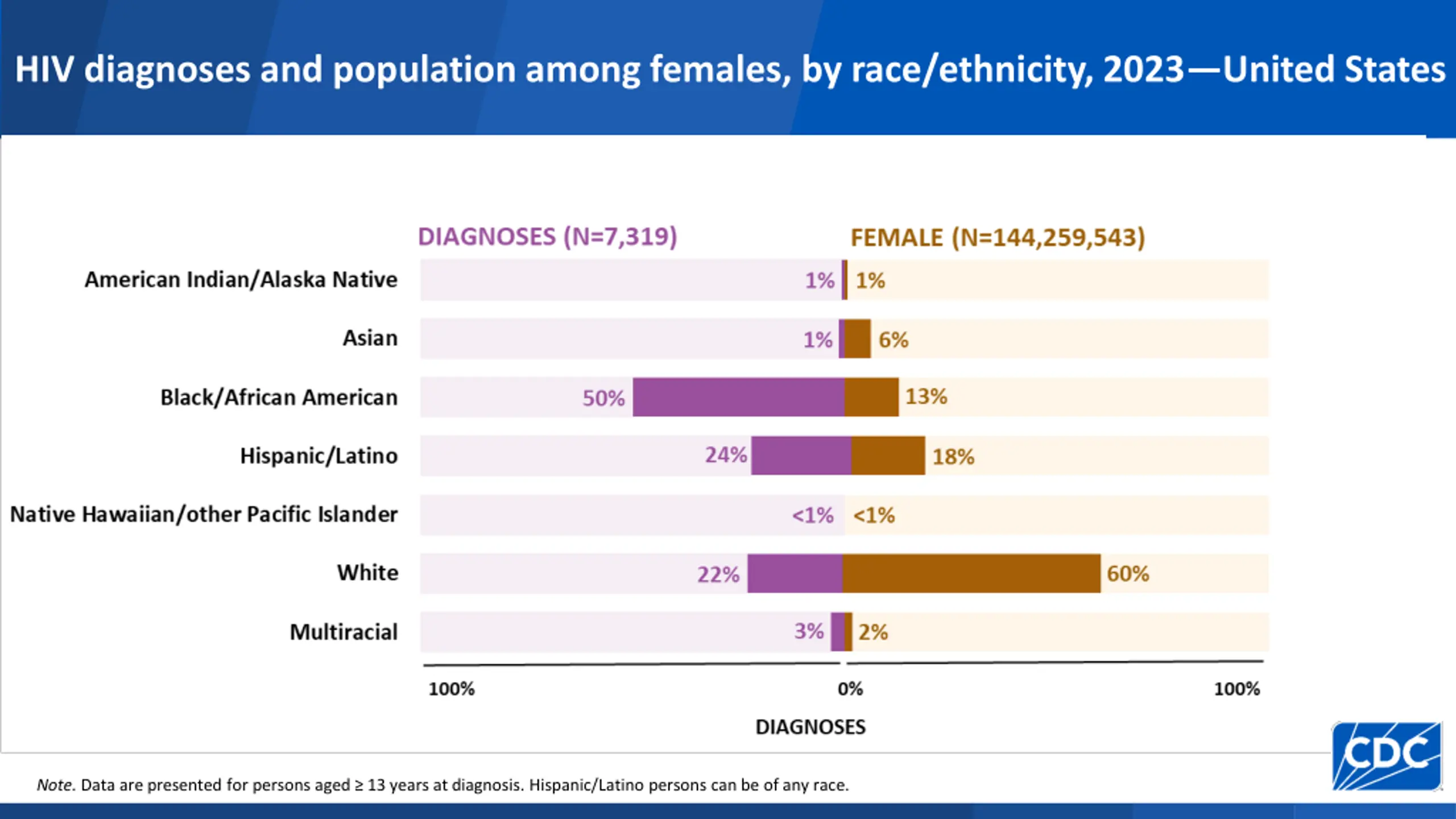 HIV diagnoses and population among females, by race/ethnicity, 2023United States Note. Data are presented for persons aged 13 years at diagnosis. Hispanic/Latino persons can be of any race.