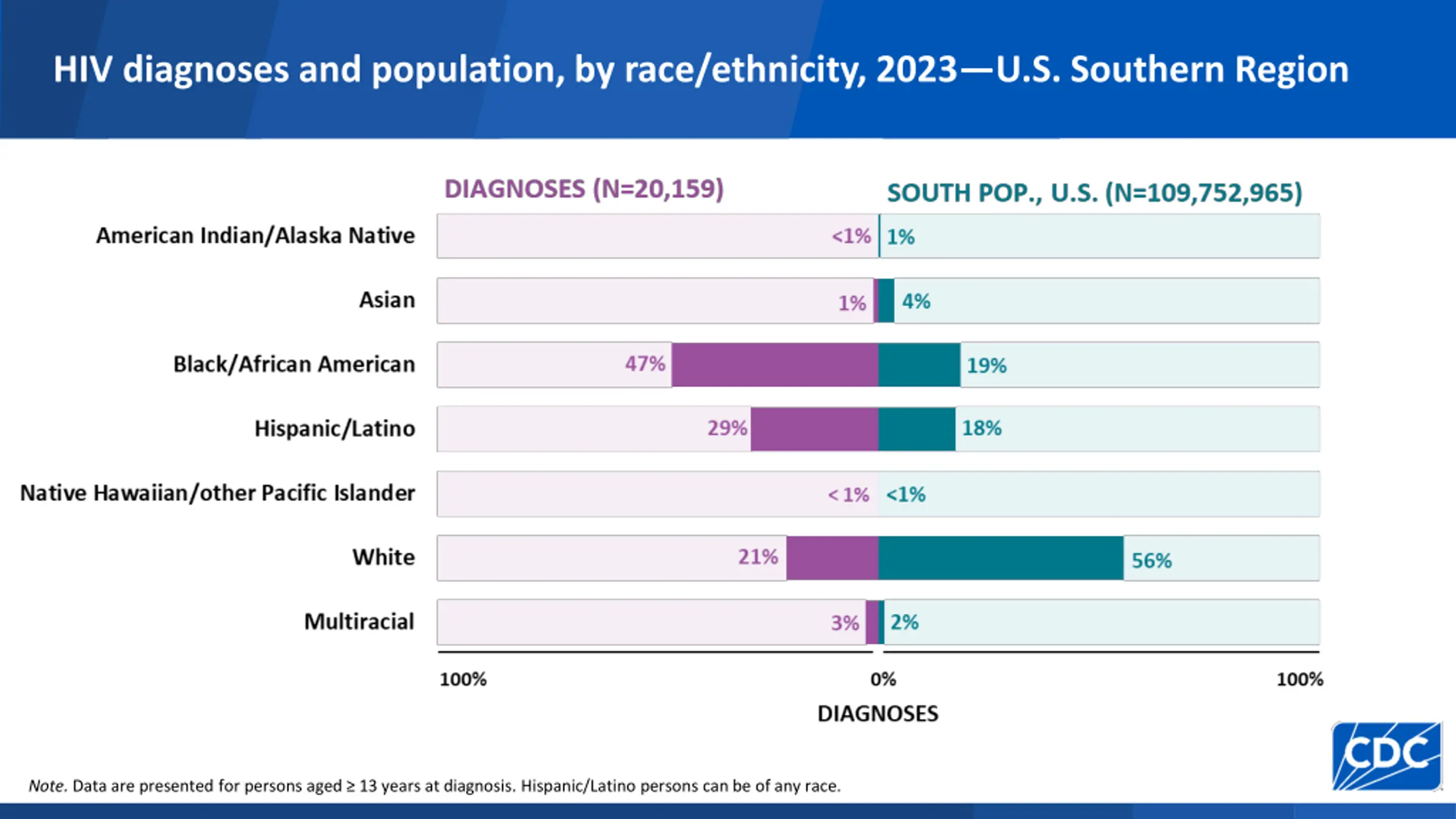 HIV diagnoses and population, by race/ethnicity, 2023U.S. Southern Region Note. Data are presented for persons aged 13 years at diagnosis. Hispanic/Latino persons can be of any race.