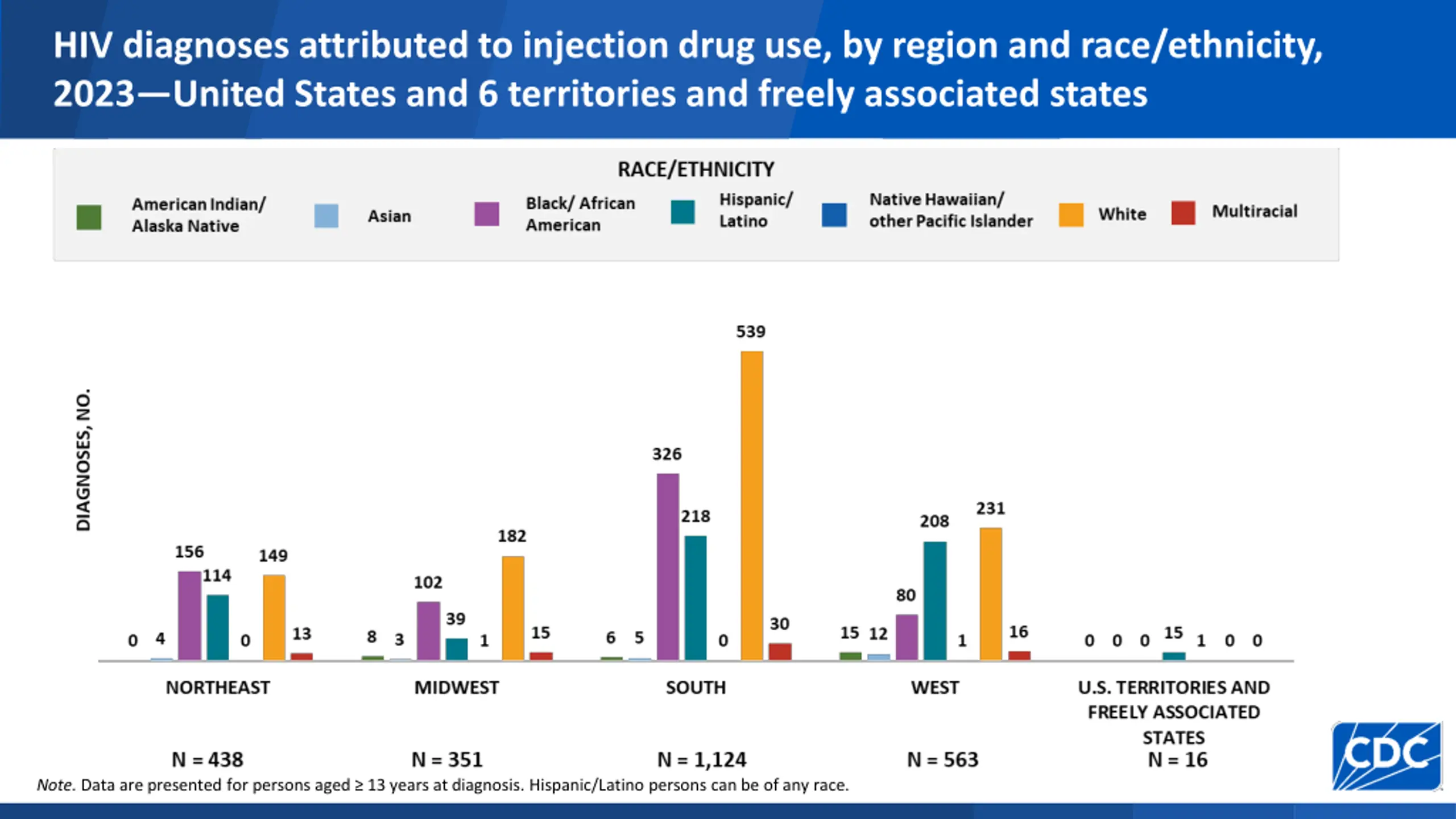 HIV diagnoses attributed to injection drug use, by region and race/ethnicity, 2023 United States and 6 territories and freely associated states Note. Data are presented for persons aged 13 years at diagnosis. Hispanic/Latino persons can be of any race.