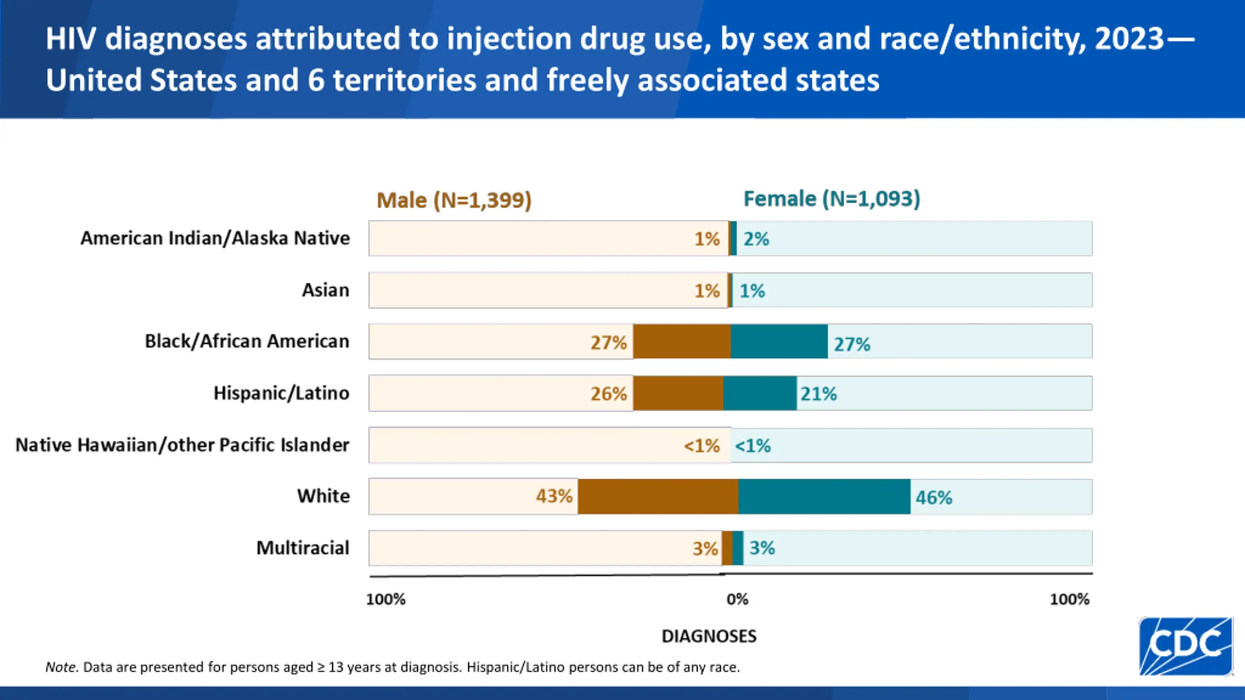 HIV diagnoses attributed to injection drug use, by sex and race/ethnicity, 2023 United States and 6 territories and freely associated states Note. Data are presented for persons aged 13 years at diagnosis. Hispanic/Latino persons can be of any race.