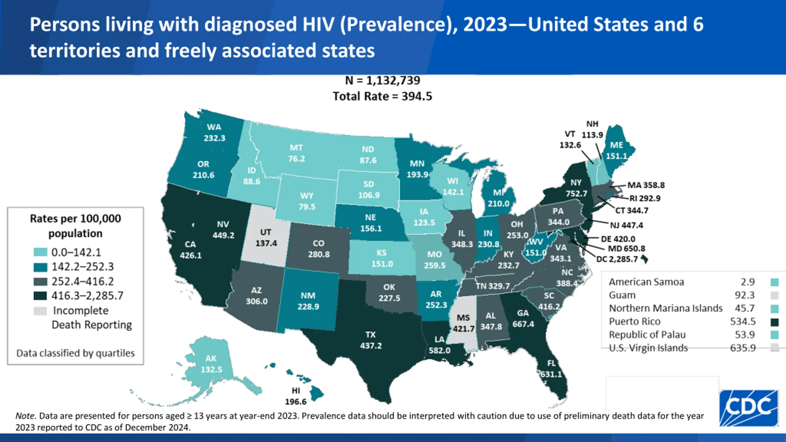 Persons living with diagnosed HIV (Prevalence), 2023United States and 6 territories and freely associated states Note. Data are presented for persons aged 13 years at year-end 2023. Prevalence data should be interpreted with caution due to use of preliminary death data for the year 2023 reported to CDC as of December 2024.