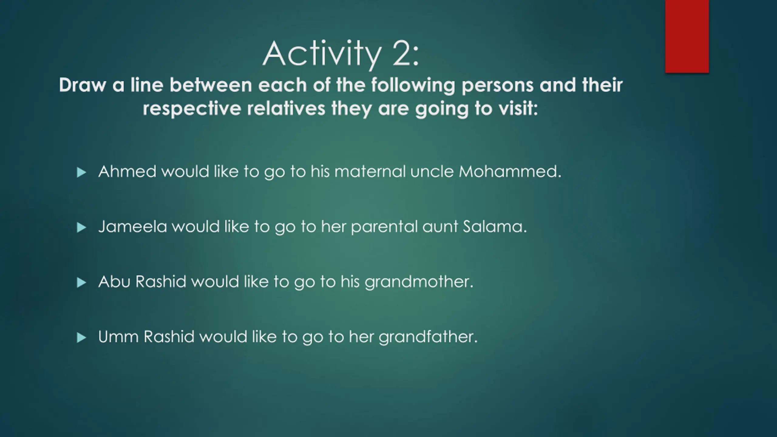Activity 2: Draw a line between each of the following persons and their respective relatives they are going to visit: Ahmed would like to go to his maternal uncle Mohammed. Jameela would like to go to her parental aunt Salama. Abu Rashid would like to go to his grandmother. Umm Rashid would like to go to her grandfather.