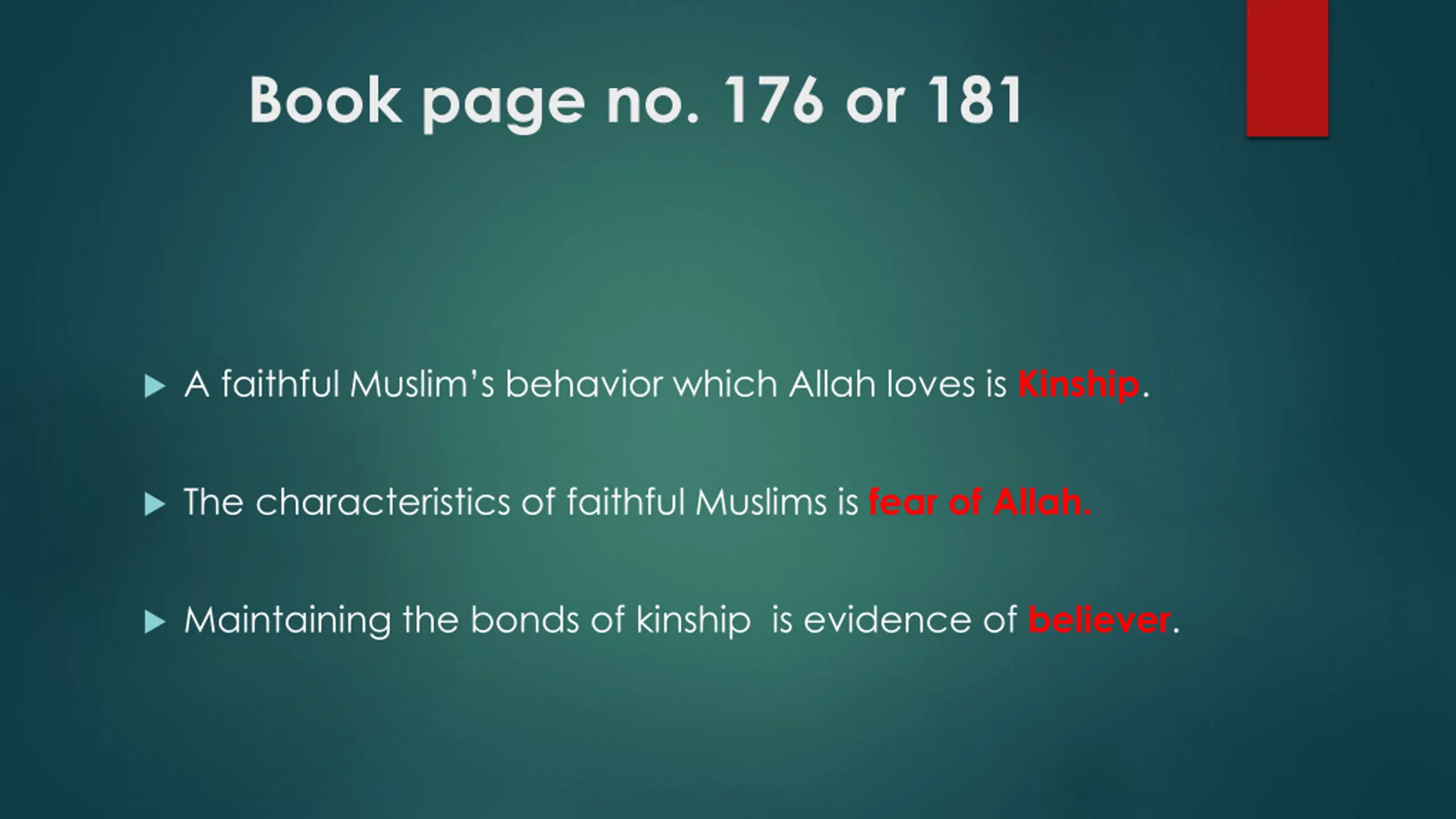 Book page no. 176 or 181 A faithful Muslim s behavior which Allah loves is Kinship. The characteristics of faithful Muslims is fear of Allah. Maintaining the bonds of kinship is evidence of believer.