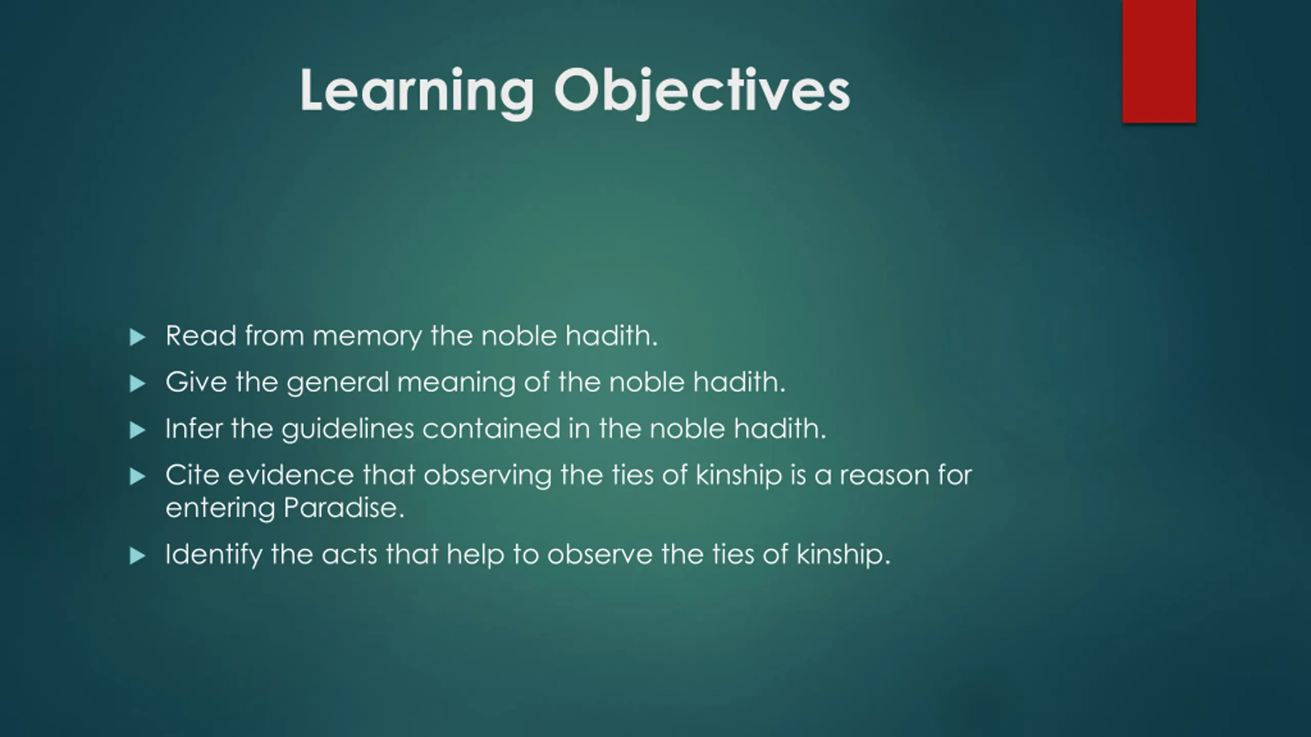 Learning Objectives Read from memory the noble hadith. Give the general meaning of the noble hadith. Infer the guidelines contained in the noble hadith. Cite evidence that observing the ties of kinship is a reason for entering Paradise. Identify the acts that help to observe the ties of kinship.
