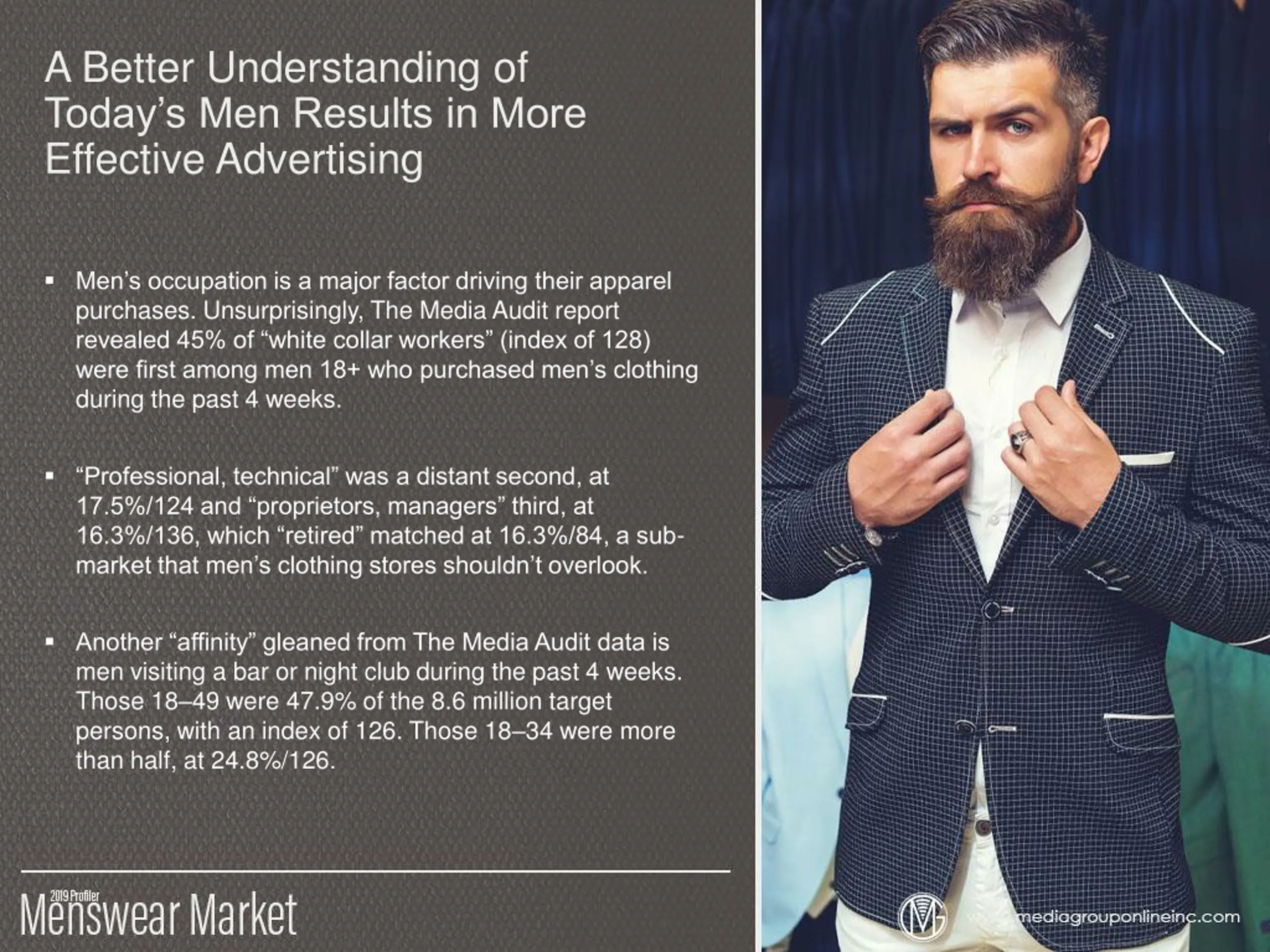 A Better Understanding of Today s Men Results in More Effective Advertising Men s occupation is a major factor driving their apparel purchases. Unsurprisingly, The Media Audit report revealed 45% of white collar workers (index of 128) were first among men 18+ who purchased men s clothing during the past 4 weeks. Professional, technical was a distant second, at 17.5%/124 and proprietors, managers third, at 16.3%/136, which retired matched at 16.3%/84, a sub- market that men s clothing stores shouldn t overlook. Another affinity gleaned from The Media Audit data is men visiting a bar or night club during the past 4 weeks. Those 18 49 were 47.9% of the 8.6 million target persons, with an index of 126. Those 18 34 were more than half, at 24.8%/126.