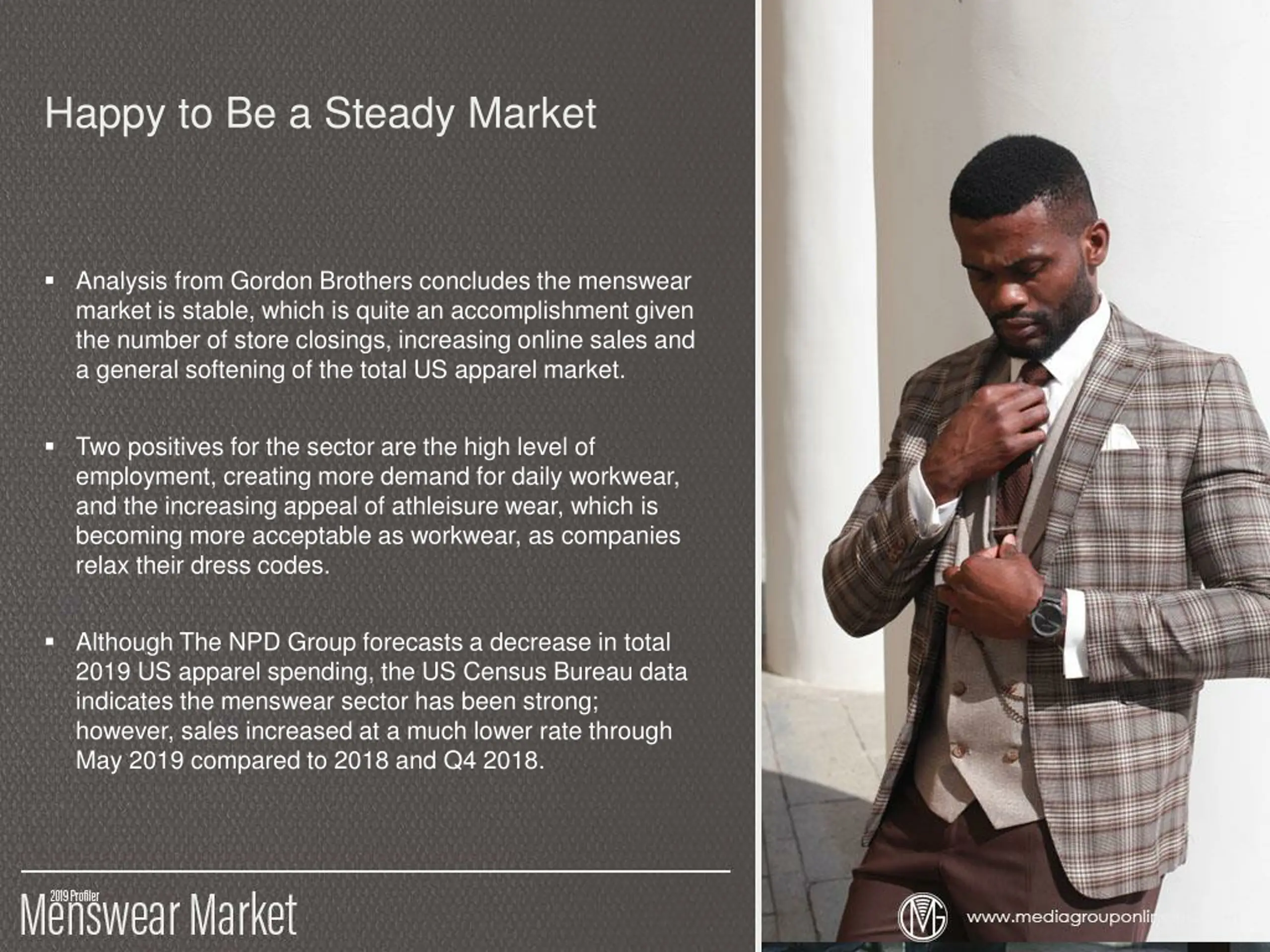Happy to Be a Steady Market Analysis from Gordon Brothers concludes the menswear market is stable, which is quite an accomplishment given the number of store closings, increasing online sales and a general softening of the total US apparel market. Two positives for the sector are the high level of employment, creating more demand for daily workwear, and the increasing appeal of athleisure wear, which is becoming more acceptable as workwear, as companies relax their dress codes. Although The NPD Group forecasts a decrease in total 2019 US apparel spending, the US Census Bureau data indicates the menswear sector has been strong; however, sales increased at a much lower rate through May 2019 compared to 2018 and Q4 2018.