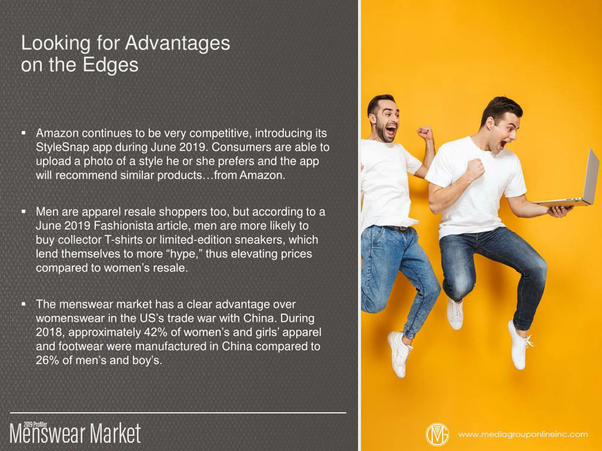 Looking for Advantages on the Edges Amazon continues to be very competitive, introducing its StyleSnap app during June 2019. Consumers are able to upload a photo of a style he or she prefers and the app will recommend similar products from Amazon. Men are apparel resale shoppers too, but according to a June 2019 Fashionista article, men are more likely to buy collector T-shirts or limited-edition sneakers, which lend themselves to more hype, thus elevating prices compared to women s resale. The menswear market has a clear advantage over womenswear in the US s trade war with China. During 2018, approximately 42% of women s and girls apparel and footwear were manufactured in China compared to 26% of men s and boy s.