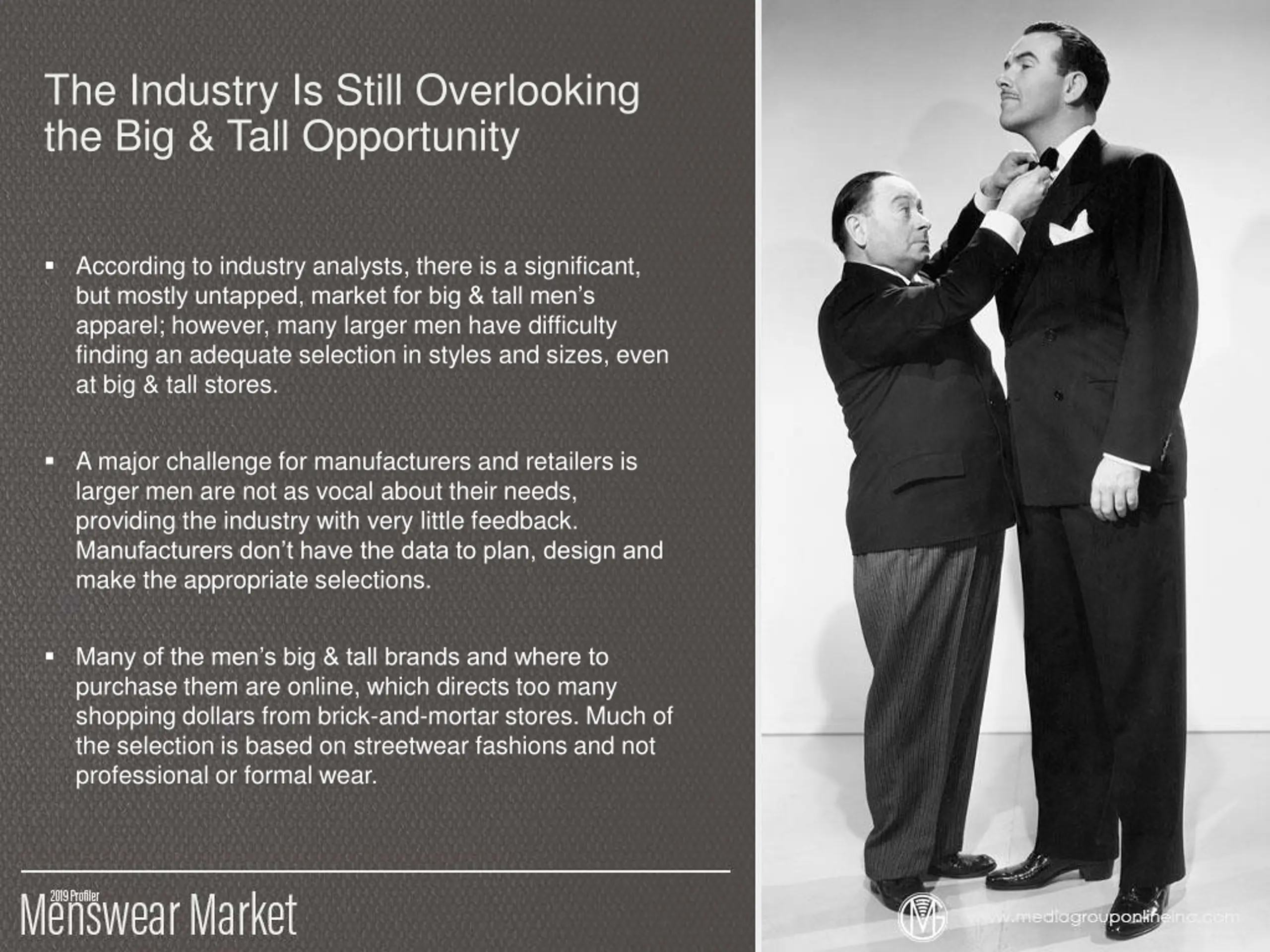 The Industry Is Still Overlooking the Big & Tall Opportunity According to industry analysts, there is a significant, but mostly untapped, market for big & tall men s apparel; however, many larger men have difficulty finding an adequate selection in styles and sizes, even at big & tall stores. A major challenge for manufacturers and retailers is larger men are not as vocal about their needs, providing the industry with very little feedback. Manufacturers don t have the data to plan, design and make the appropriate selections. Many of the men s big & tall brands and where to purchase them are online, which directs too many shopping dollars from brick-and-mortar stores. Much of the selection is based on streetwear fashions and not professional or formal wear.