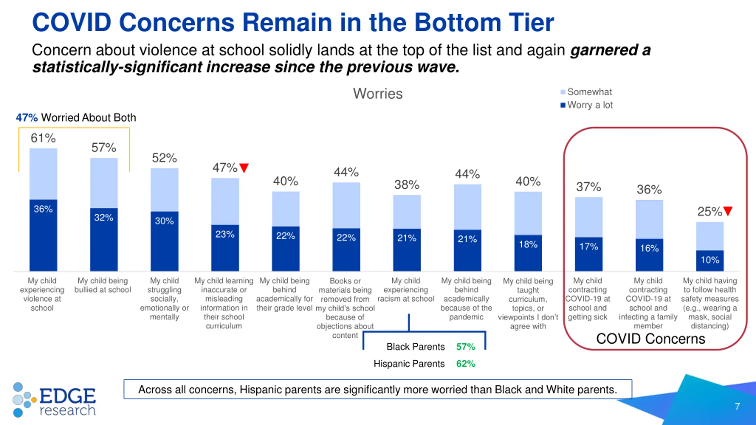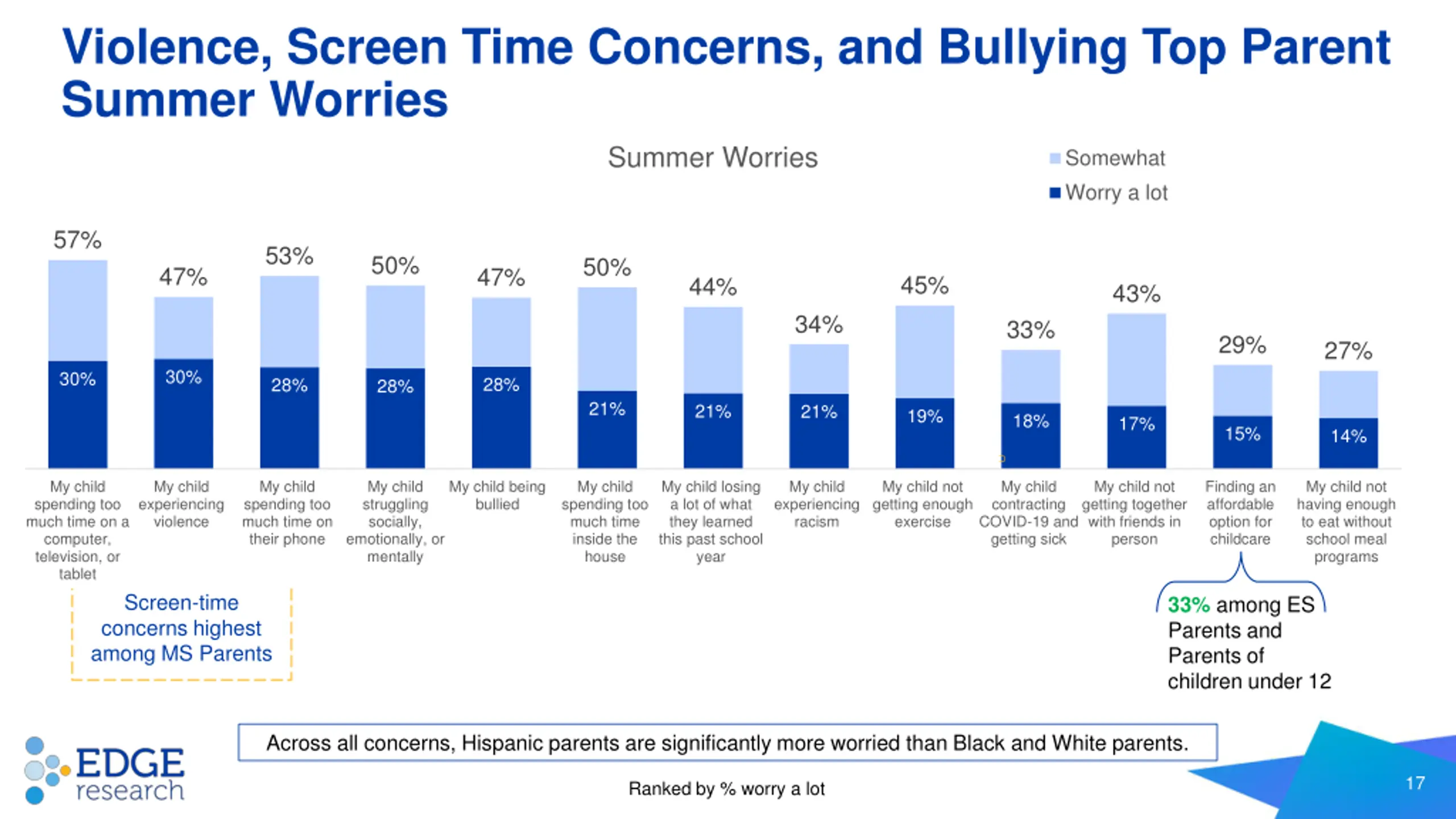 Top Takeaways The final wave of this tracking program continues the trend of parents indicating comfort with their children in school. Over half (55%) are very comfortable having their children in school. In addition, for the first time in this research, approximately half (49%) believe the pandemic is almost over (23%) or over (26%). 1 School violence and bullying lead parental concerns. Over six-in-ten (61%) worry a lot or somewhat about school violence, and this worry experienced the largest increase over the course of this research effort (COVID-related concerns saw the most significant declines.). When asked about summer concerns, parents add too much screen or phone time to their top-tier concerns. 2 The data remind us that parents want to be a part of school efforts to support their child s emotional and mental health.Most strongly support schools providing services to buoy students emotional and mental health, and they believe it is healthy for students to have the opportunity to share their thoughts and feelings with other trusted adults who are not their parents. That said, parents unequivocally want to know if the school is providing their child with emotional and mental health support. 3 A majority of parents indicate they are very interested in summer programs/activities designed to keep their children physically active, interacting with other children, and/or supporting their learning. That said, there is a significant gap between parent interest and their knowledge of whether such programs or resources (e.g., school counselor, school psychologist) are available/accessible through their child s school this summer. 4 Parents overwhelmingly want schools to provide safe learning environments where all students have a voice and use historically accurate educational materials. And, while most believe it is important that students learn how to identify misinformation in the research they conduct (E.g., for school projects), few parents indicate schools currently teach these skills. 5 3