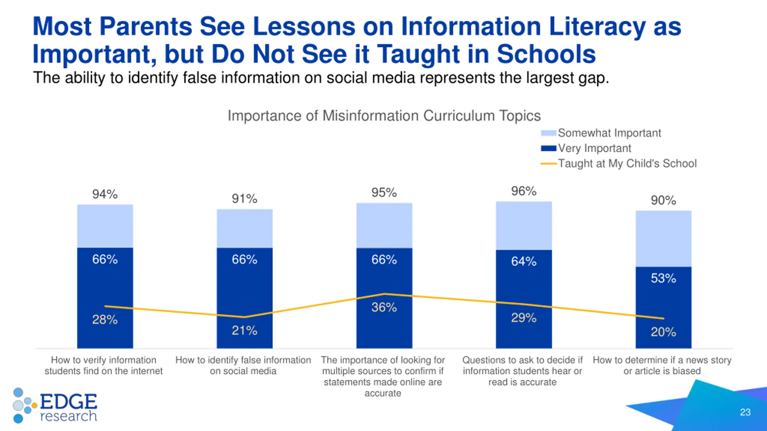 Most Parents See Lessons on Information Literacy as Important, but Do Not See it Taught in Schools The ability to identify false information on social media represents the largest gap. Importance of Misinformation Curriculum Topics Somewhat Important Very Important Taught at My Child's School 96% 95% 94% 91% 90% 66% 66% 66% 64% 53% 36% 29% 28% 21% 20% How to verify information students find on the internet How to identify false information on social media The importance of looking for multiple sources to confirm if statements made online are accurate Questions to ask to decide if information students hear or read is accurate How to determine if a news story or article is biased 23