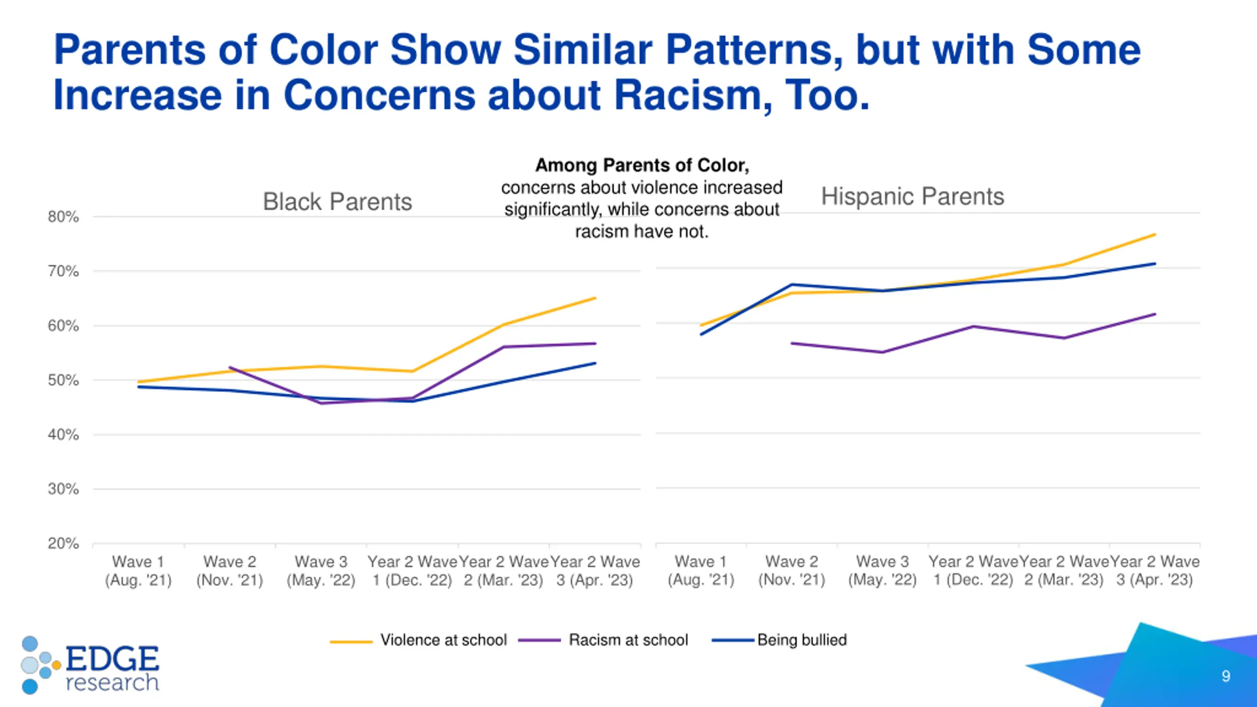 While COVID Concerns Have Fallen, Violence and Bullying Have Risen Significantly Academic concerns have also declined since August 2021. Select Parent Worries Over Time 65% Violence at school 60% Being bullied 55% 50% 45% Being behind academically 40% My child getting COVID 35% 30% 25% Having to follow COVID safety measures 20% Wave 1 (Aug. '21) Wave 2 (Nov. '21) Wave 3 (May. '22) Year 2 Wave 1 (Dec. '22) Year 2 Wave 2 (Mar. '23) Year 2 Wave 3 (Apr. '23) 8