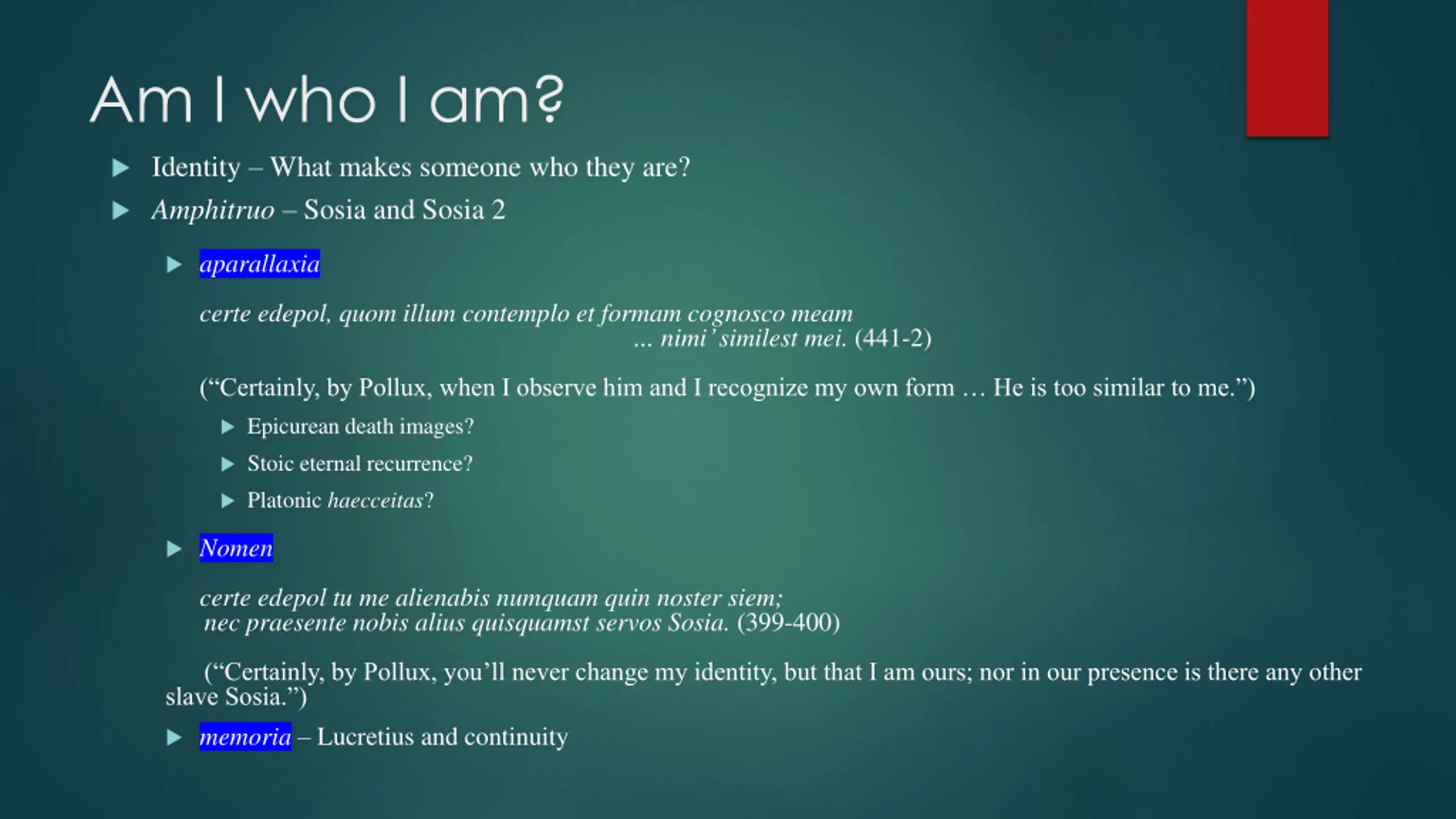 Am I who I am? Identity What makes someone who they are? Amphitruo Sosia and Sosia 2 aparallaxia certe edepol, quom illum contemplo et formam cognosco meam nimi similest mei. (441-2) ( Certainly, by Pollux, when I observe him and I recognize my own form He is too similar to me. ) Epicurean death images? Stoic eternal recurrence? Platonic haecceitas? Nomen certe edepol tu me alienabis numquam quin noster siem; nec praesente nobis alius quisquamst servos Sosia. (399-400) ( Certainly, by Pollux, you ll never change my identity, but that I am ours; nor in our presence is there any other slave Sosia. ) memoria Lucretius and continuity